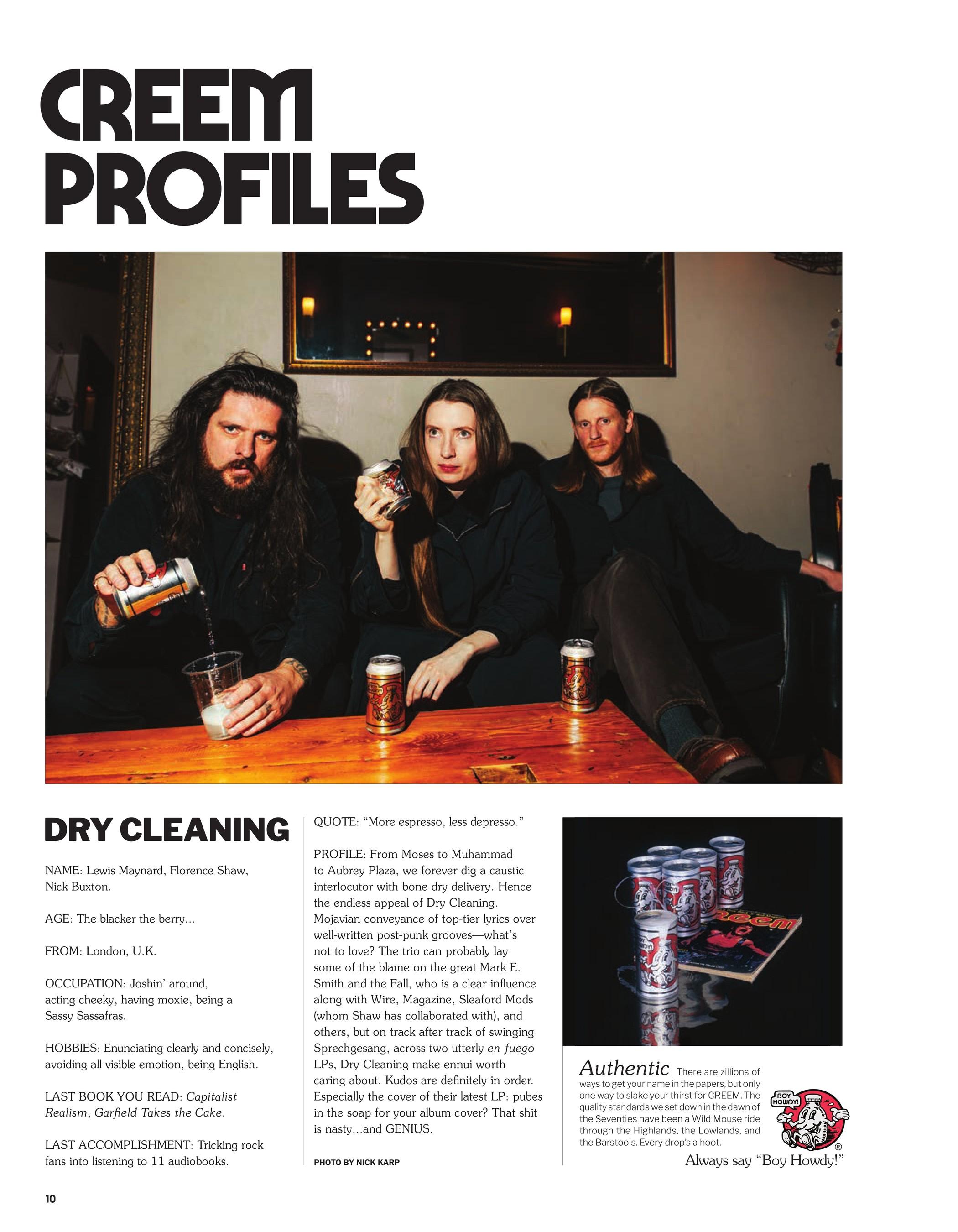 PROFILE: From Moses to Muhammad to Aubrey Plaza, we forever dig a caustic interlocutor with bone-dry delivery. Hence the endless appeal of Dry Cleaning. Mojavian conveyance of top-tier lyrics over well-written post-punk grooves—what’s not to love? The trio can probably lay some of the blame on the great Mark E. Smith and the Fall, who is a clear influence along with Wire, Magazine, Sleaford Mods (whom Shaw has collaborated with), and others, but on track after track of swinging Sprechgesang, across two utterly en fuego LPs, Dry Cleaning make ennui worth caring about. Kudos are definitely in order. Especially the cover of their latest LP: pubes in the soap for your album cover? That shit is nasty...and GENIUS.