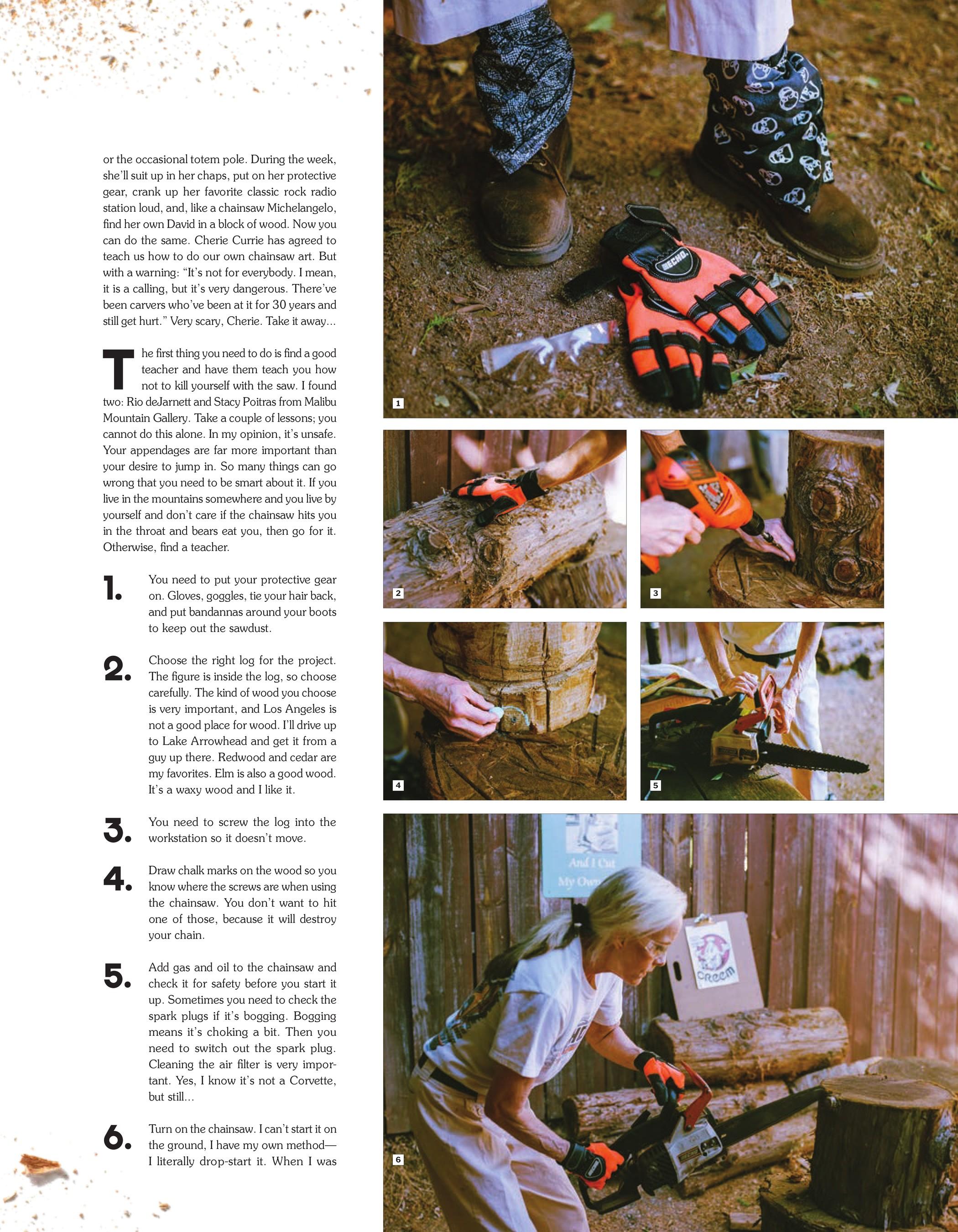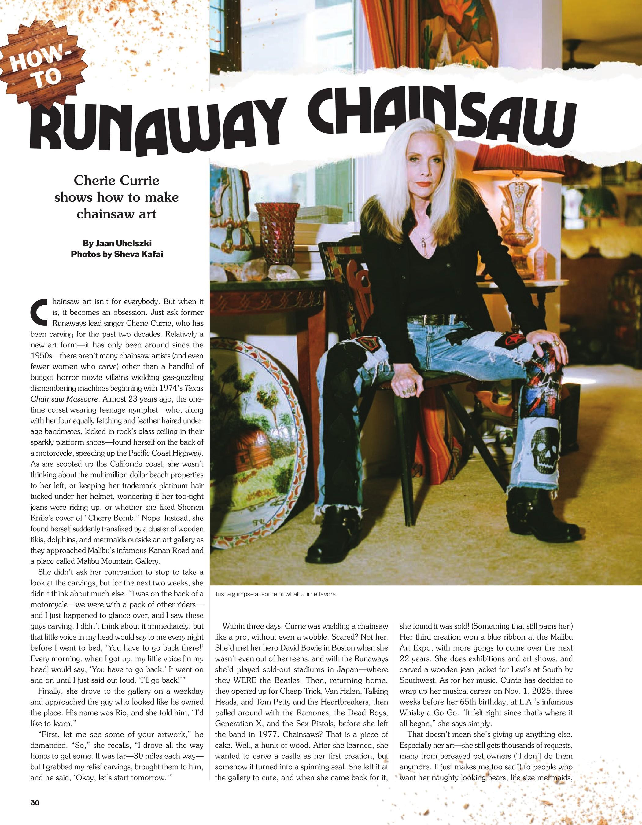 Chainsaw art isn’t for everybody. But when it is, it becomes an obsession. Just ask former Runaways lead singer Cherie Currie, who has been carving for the past two decades. Relatively a new art form—it has only been around since the 1950s—there aren’t many chainsaw artists (and even fewer women who carve) other than a handful of budget horror movie villains wielding gas-guzzling dismembering machines beginning with 1974’s Texas Chainsaw Massacre. Almost 23 years ago, the onetime corset-wearing teenage nymphet—who, along with her four equally fetching and feather-haired underage bandmates, kicked in rock’s glass ceiling in their sparkly platform shoes—found herself on the back of a motorcycle, speeding up the Pacific Coast Highway. As she scooted up the California coast, she wasn’t thinking about the multimillion-dollar beach properties to her left, or keeping her trademark platinum hair tucked under her helmet, wondering if her too-tight jeans were riding up, or whether she liked Shonen Knife’s cover of “Cherry Bomb.” Nope. Instead, she found herself suddenly transfixed by a cluster of wooden tikis, dolphins, and mermaids outside an art gallery as they approached Malibu’s infamous Kanan Road and a place called Malibu Mountain Gallery.