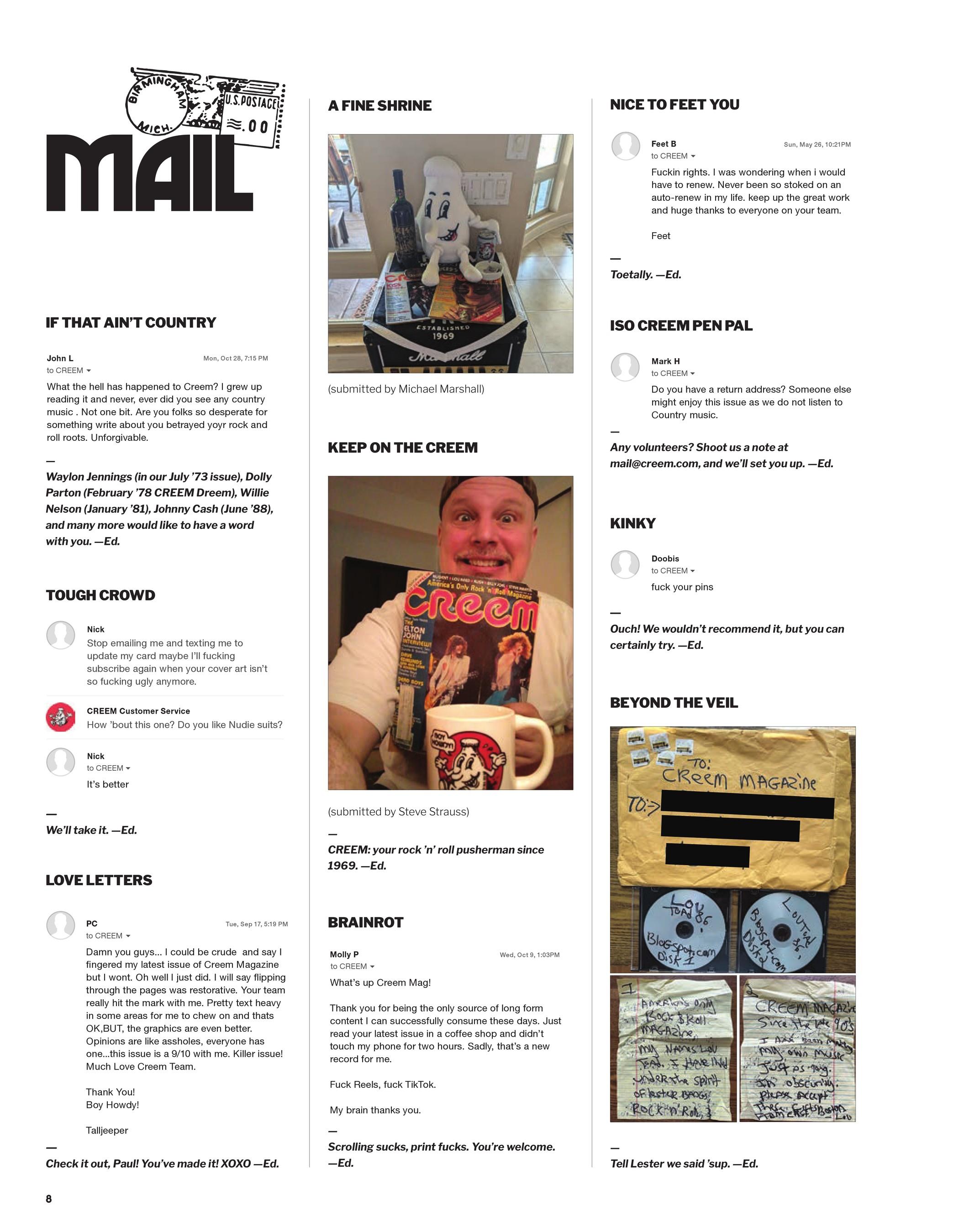 Please send letters to: Mail Department CREEM Magazine 1525 N Alvarado St #261009 Los Angeles, CA 90026 Or, if you’re lazy: mail@creem.com