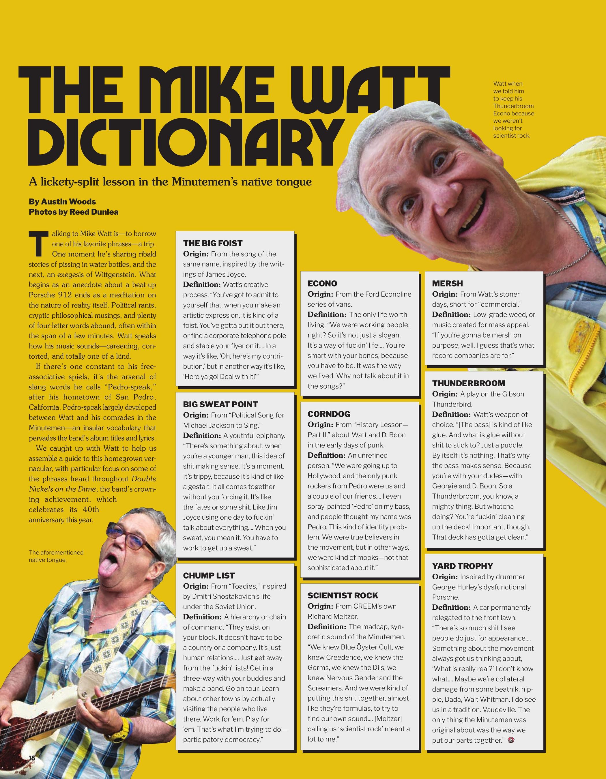 If there’s one constant to his free-associative spiels, it’s the arsenal of slang words he calls “Pedro-speak,” after his hometown of San Pedro, California. Pedro-speak largely developed between Watt and his comrades in the Minutemen—an insular vocabulary that pervades the band’s album titles and lyrics.