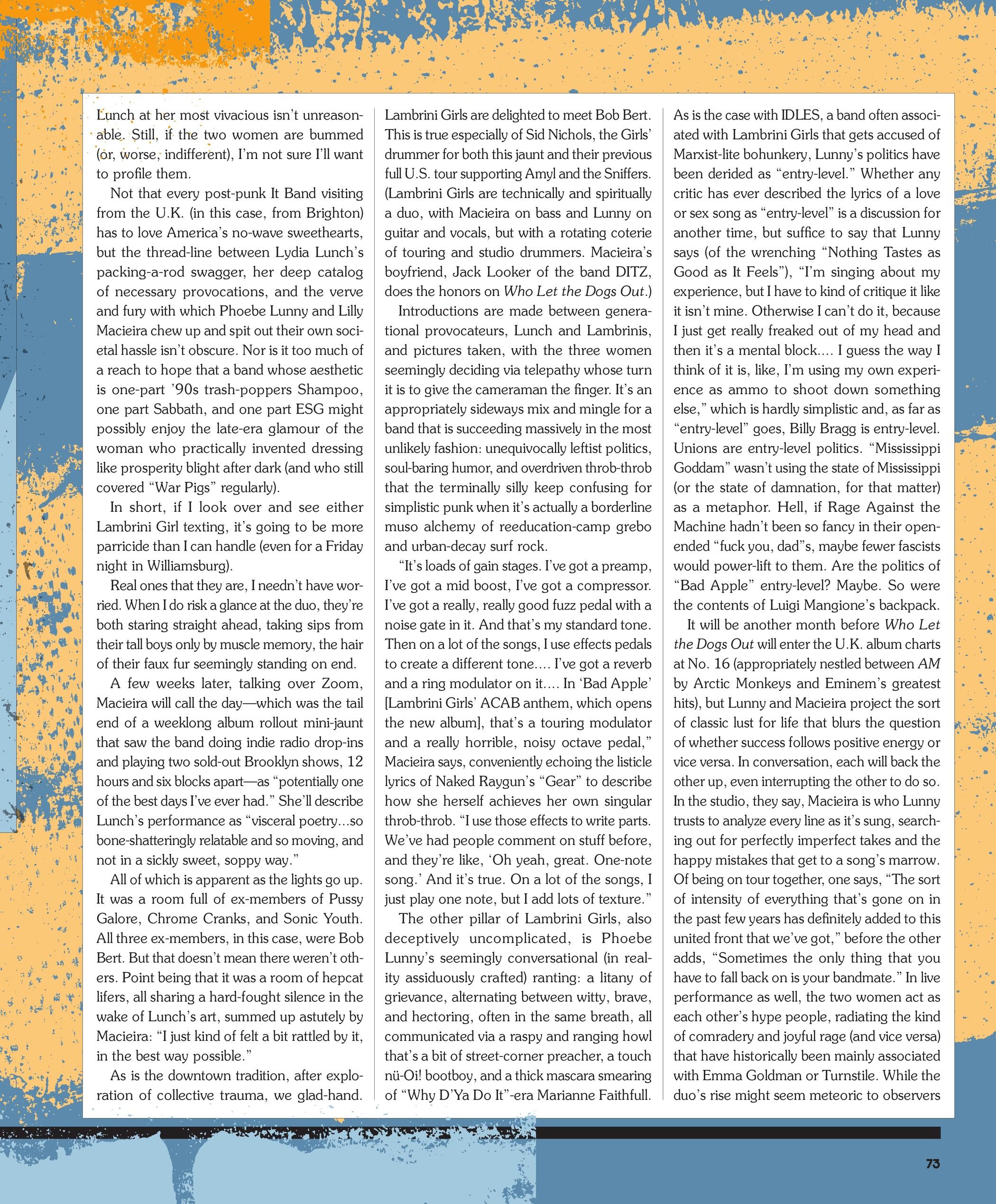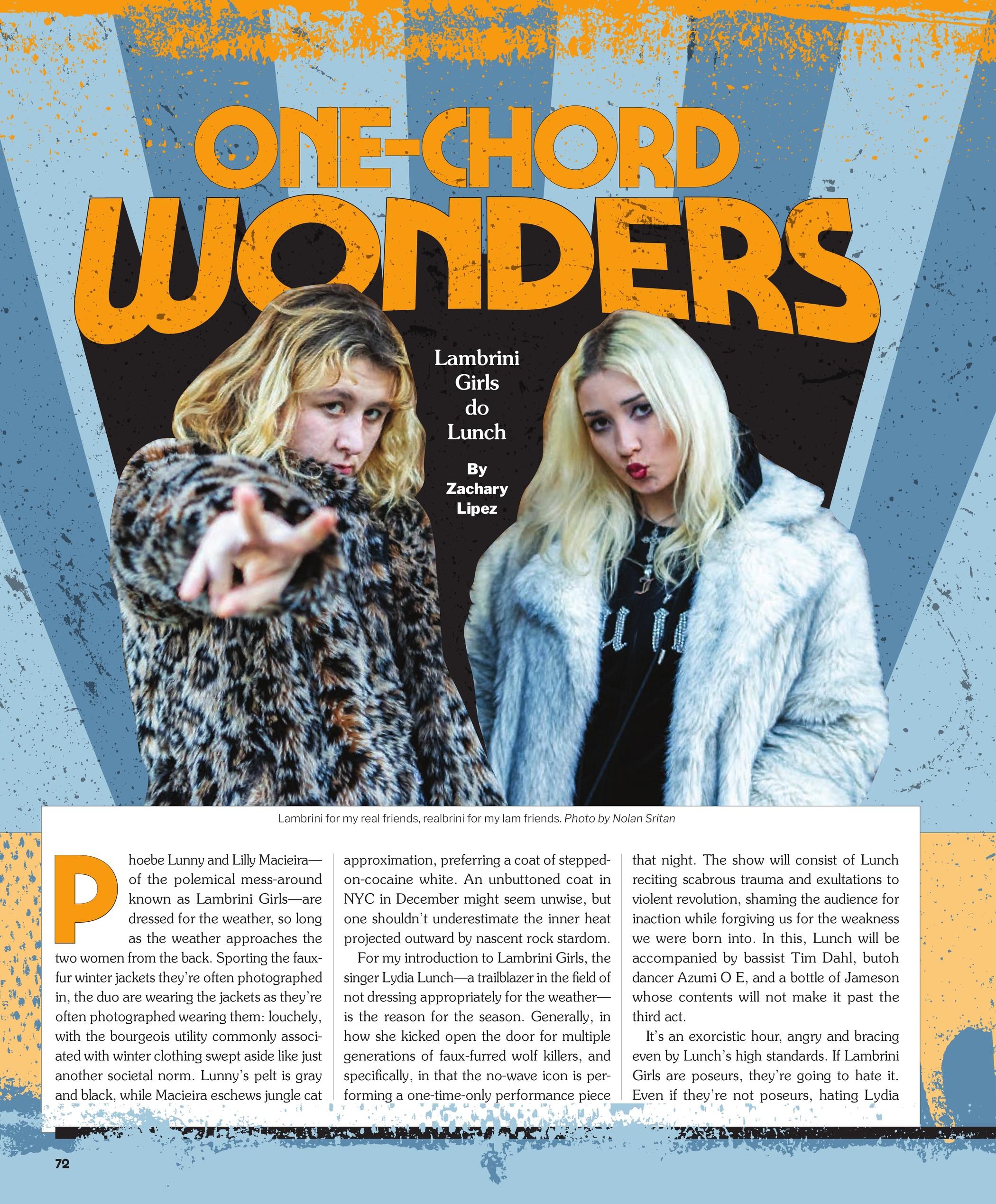 Phoebe Lunny and Lilly Macieira— of the polemical mess-around known as Lambrini Girls—are dressed for the weather, so long as the weather approaches the two women from the back. Sporting the fauxfur winter jackets they’re often photographed in, the duo are wearing the jackets as they’re often photographed wearing them: louchely, with the bourgeois utility commonly associated with winter clothing swept aside like just another societal norm. Lunny’s pelt is gray and black, while Madeira eschews jungle cat approximation, preferring a coat of steppedon-cocaine white. An unbuttoned coat in NYC in December might seem unwise, but one shouldn’t underestimate the inner heat projected outward by nascent rock stardom.