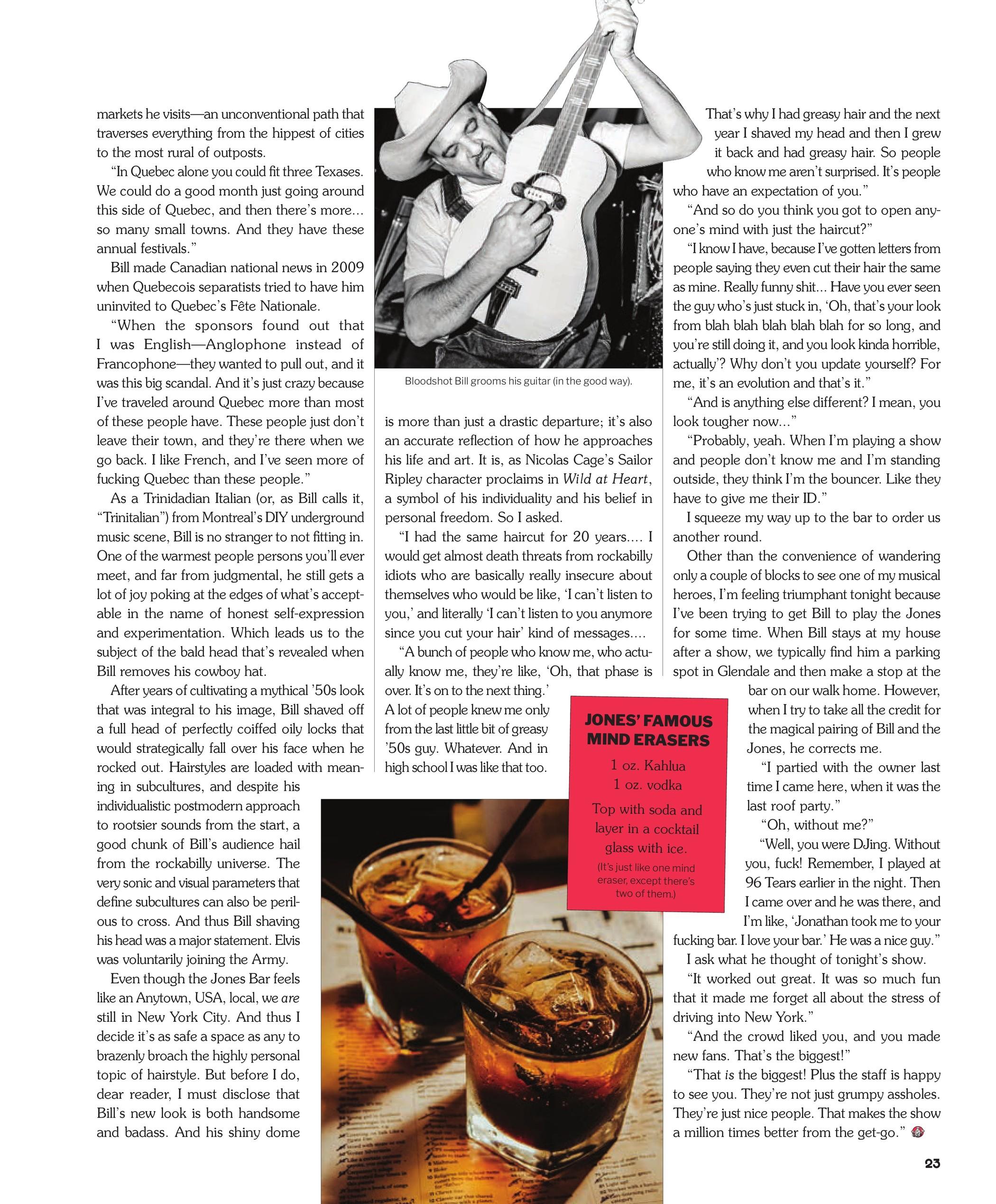 I zip up my boots and make a mad dash out into the Ridgewood, Queens, dusk to witness Bloodshot Bill around the corner at Jones Bar. Tonight my favorite one-man band is stopping off at my favorite local for a last-minute gig on his way down to a festival in New Jersey. And I don’t want to miss a beat of the Canadian rock ’n’ roll wild man’s locomotive electric guitar, kick drum, and hi-hat rhythm symphony or his broad vocabulary of howls, growls, and hollers. I’m ready to experience the fire of the exquisite entertainment spectacle that fellow Bloodshot Bill fan John Waters famously described as "Roy Orbison with a head injury."