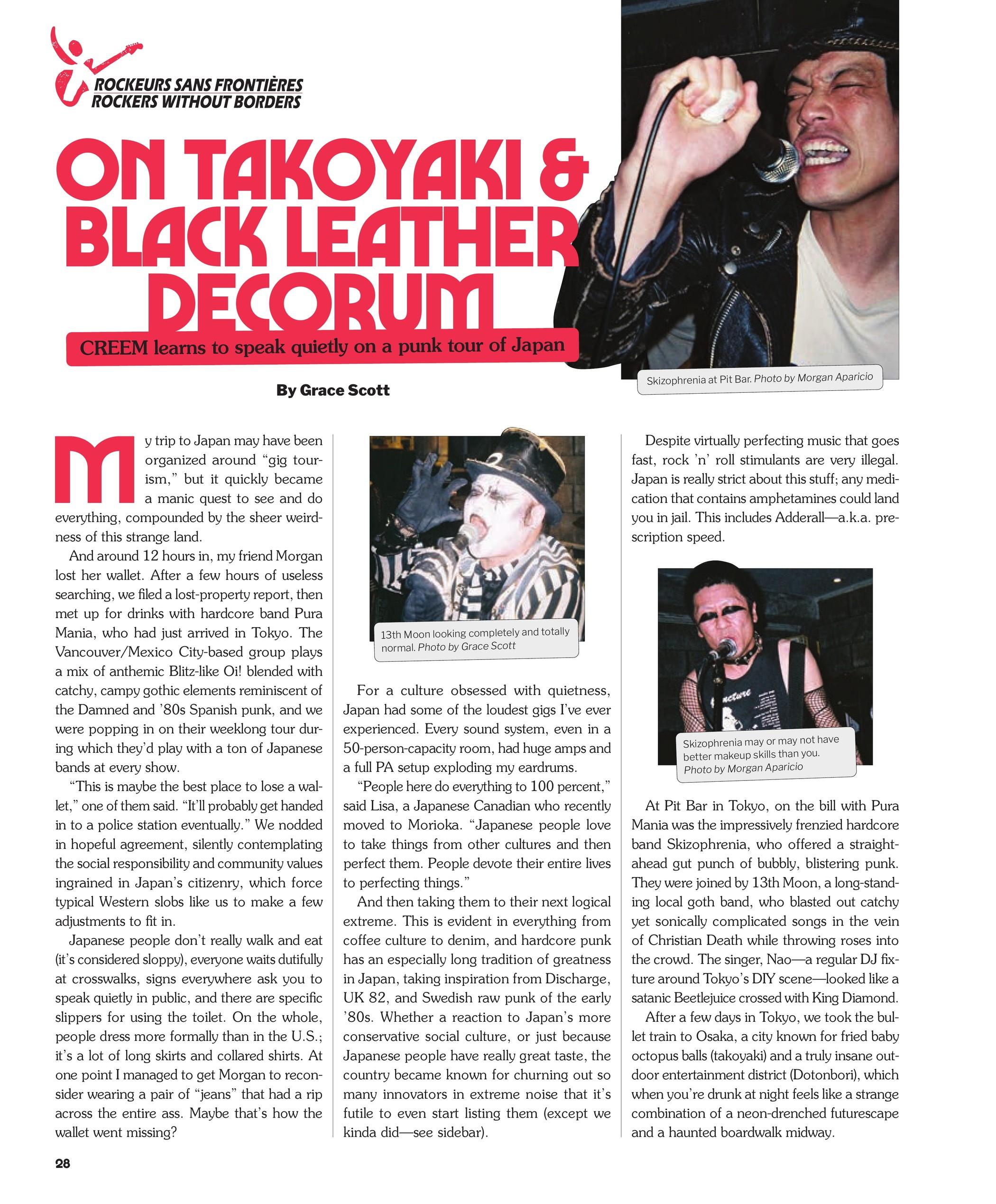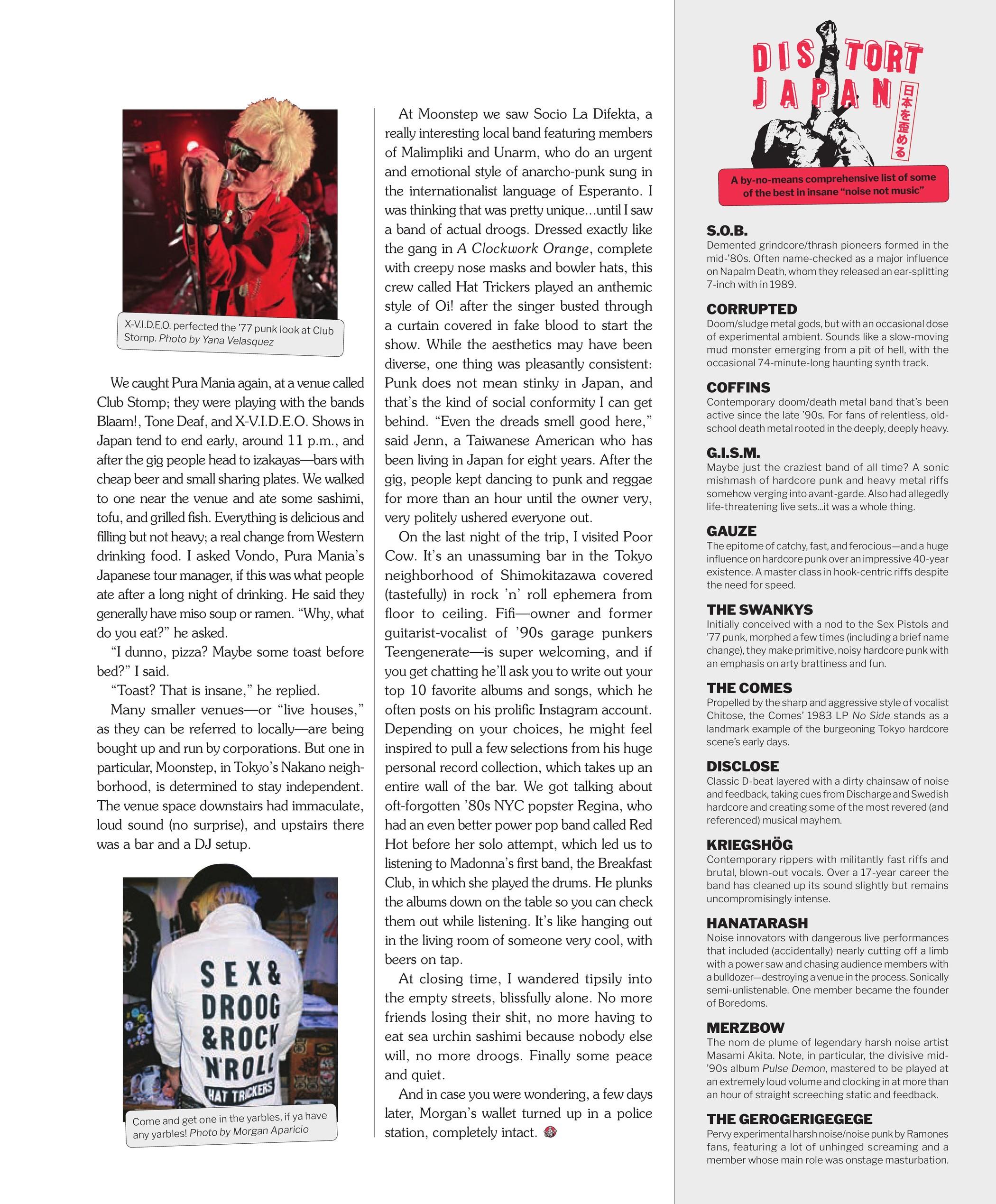 And around 12 hours in, my friend Morgan lost her wallet. After a few hours of useless searching, we filed a lost-property report, then met up for drinks with hardcore band Pura Mania, who had just arrived in Tokyo. The Vancouver/Mexico City-based group plays a mix of anthemic Blitz-like Oi! blended with catchy, campy gothic elements reminiscent of the Damned and '80s Spanish punk, and we were popping in on their weeklong tour during which they’d play with a ton of Japanese bands at every show.