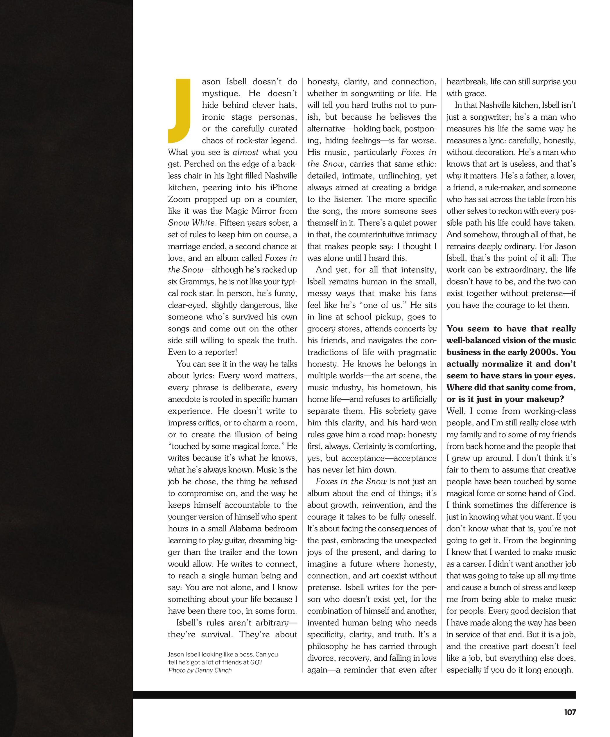 Jason Isbell doesn’t do mystique. He doesn’t hide behind clever hats, ironic stage personas, or the carefully curated chaos of rock-star legend. What you see is almost what you get. Perched on the edge of a backless chair in his light-filled Nashville kitchen, peering into his iPhone Zoom propped up on a counter, like it was the Magic Mirror from Snow White. Fifteen years sober, a set of rules to keep him on course, a marriage ended, a second chance at love, and an album called Foxes in the Snow—although he’s racked up six Grammys, he is not like your typical rock star. In person, he’s funny, clear-eyed, slightly dangerous, like someone who’s survived his own songs and come out on the other side still willing to speak the truth. Even to a reporter!