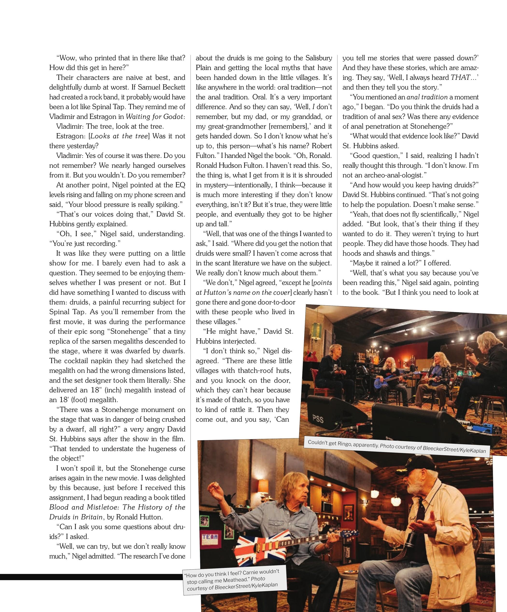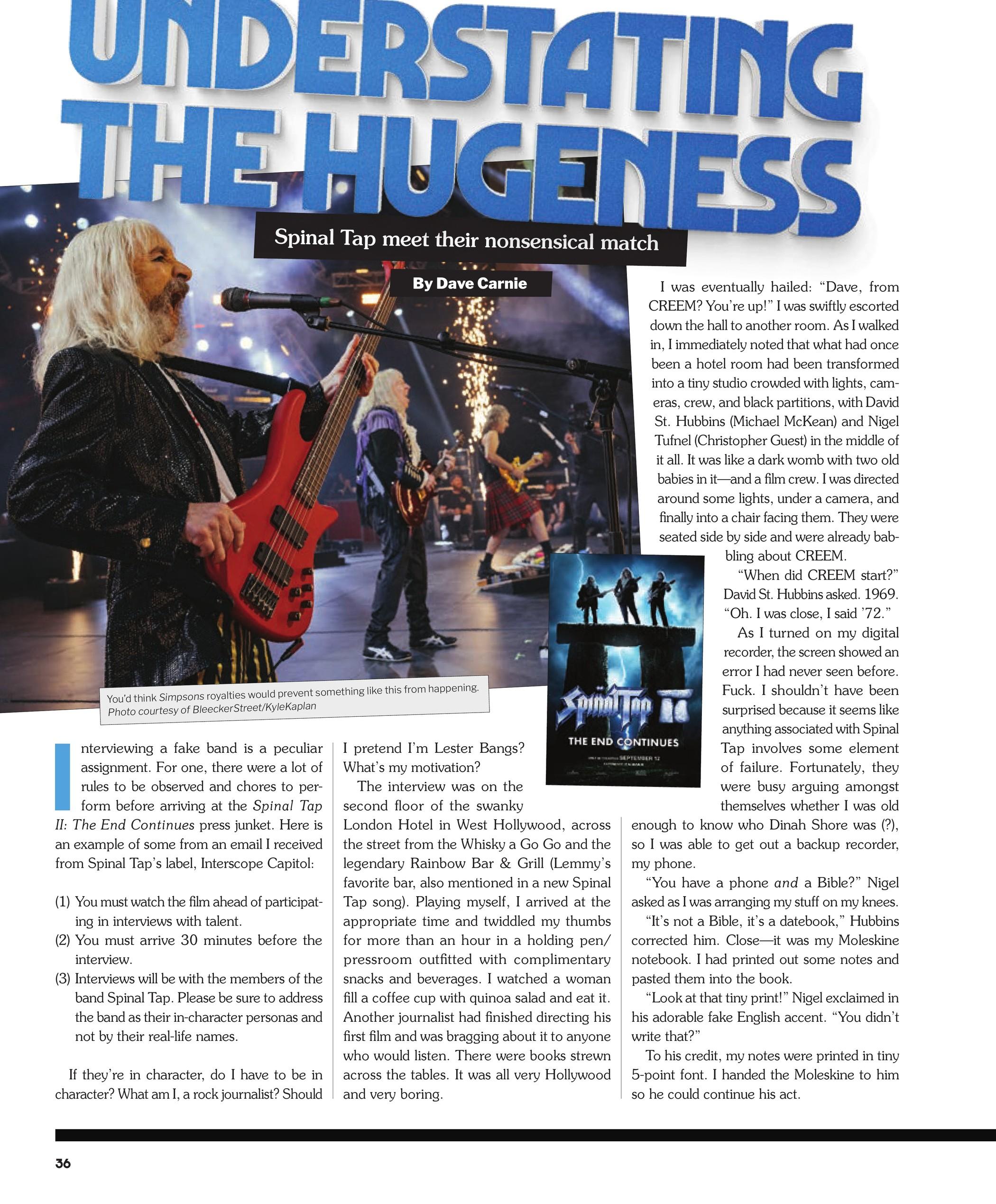 Interviewing a fake band is a peculiar assignment. For one, there were a lot of rules to be observed and chores to perform before arriving at the Spinal Tap II: The End Continues press junket. Here is an example of some from an email I received from Spinal Tap’s label, Interscope Capitol: