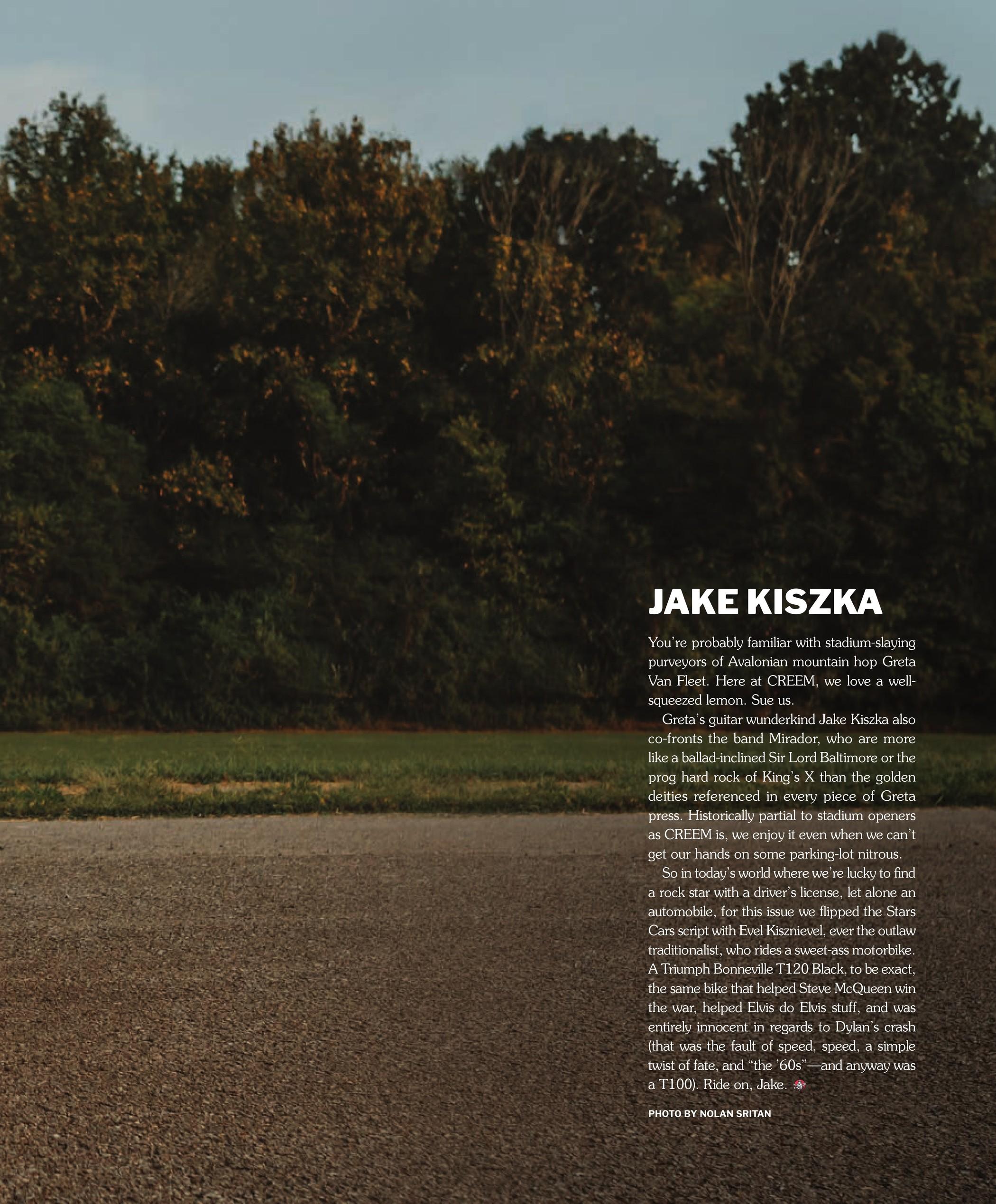 So in today’s world where we’re lucky to find a rock star with a driver’s license, let alone an automobile, for this issue we flipped the Stars Cars script with Evel Kisznievel, ever the outlaw traditionalist, who rides a sweet-ass motorbike. A Triumph Bonneville T120 Black, to be exact, the same bike that helped Steve McQueen win the war, helped Elvis do Elvis stuff, and was entirely innocent in regards to Dylan’s crash (that was the fault of speed, speed, a simple twist of fate, and “the ’60s"—and anyway was a T100). Ride on, Jake.