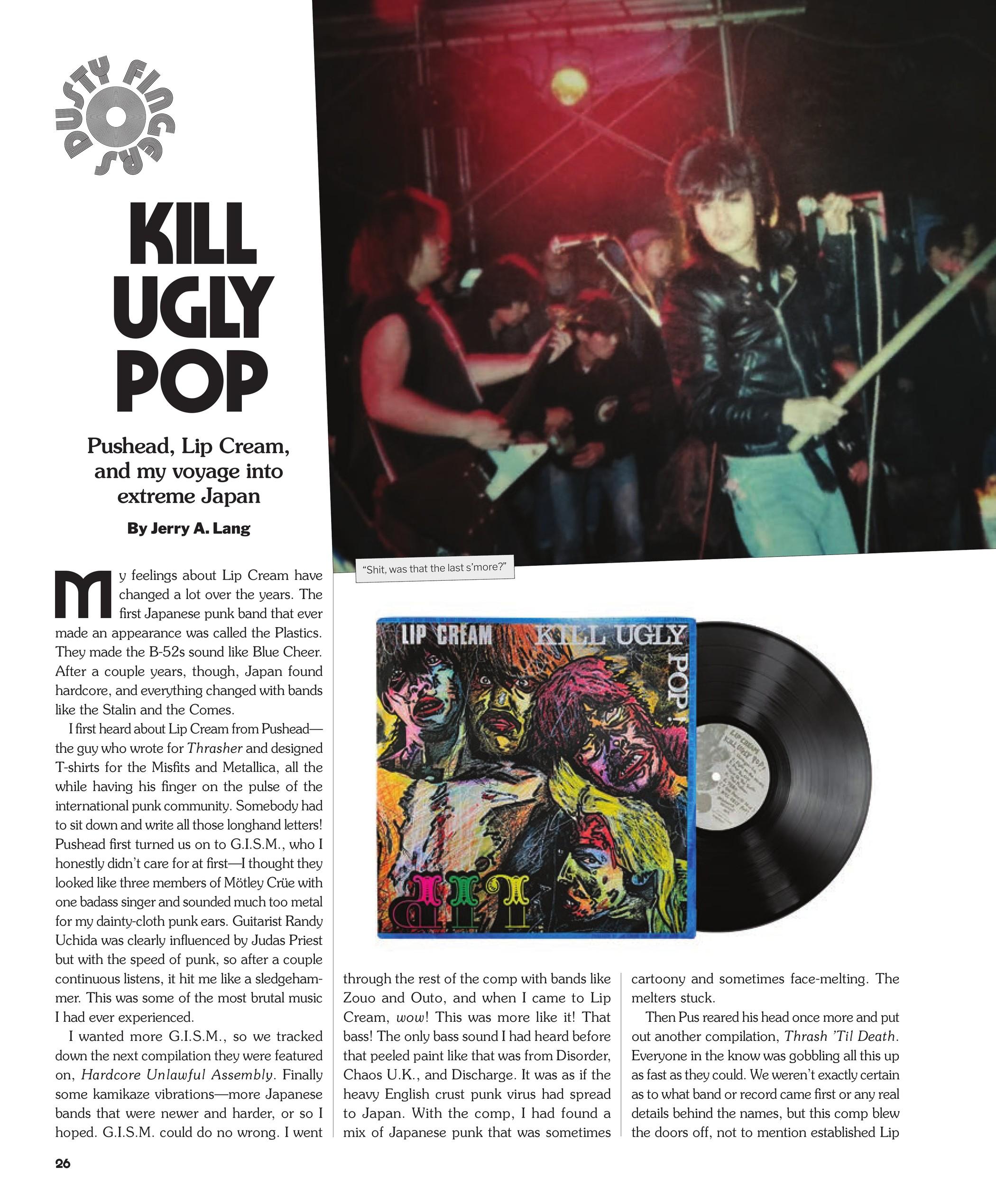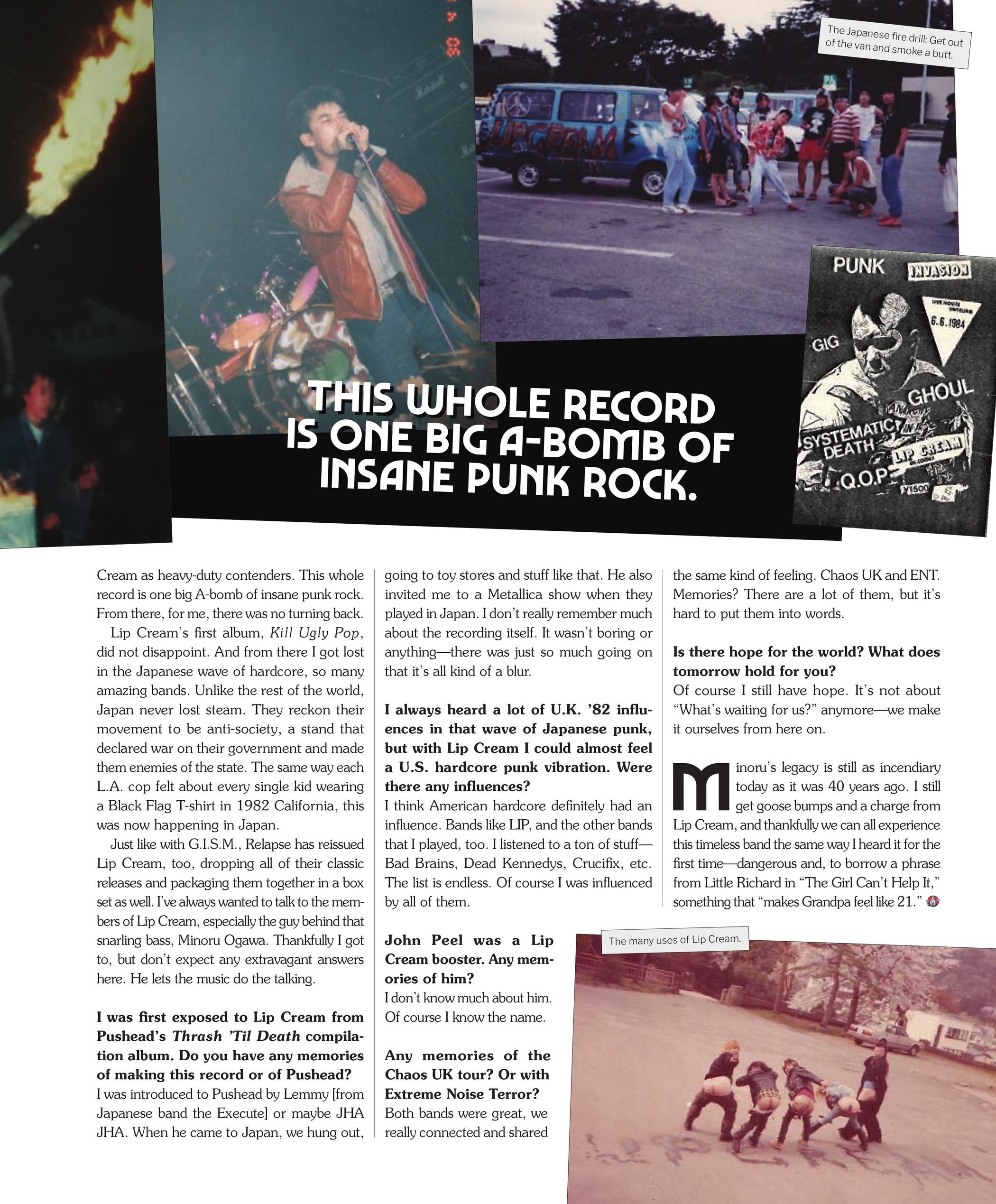 I first heard about Lip Cream from Pushead— the guy who wrote for Thrasher and designed T-shirts for the Misfits and Metallica, all the while having his finger on the pulse of the international punk community. Somebody had to sit down and write all those longhand letters! Pushead first turned us on to G.I.S.M., who I honestly didn’t care for at first—I thought they looked like three members of Motley Crüe with one badass singer and sounded much too metal for my dainty-cloth punk ears. Guitarist Randy Uchida was clearly influenced by Judas Priest but with the speed of punk, so after a couple continuous listens, it hit me like a sledgehammer. This was some of the most brutal music I had ever experienced.