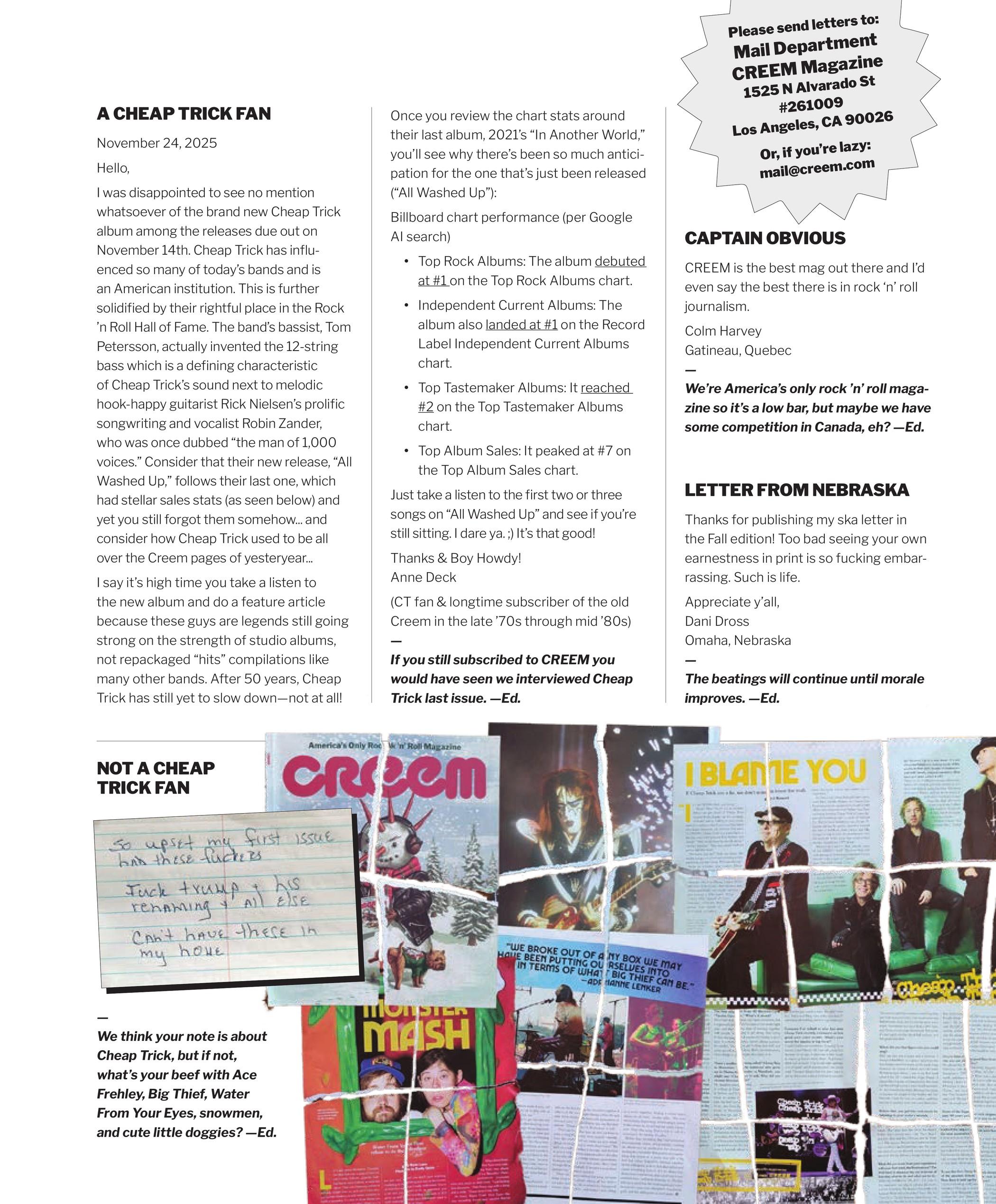 Please send letters to: Mail Department CREEM Magazine 1525 N Alvarado St #261009 Los Angeles, CA 90026 Or, if you’re lazy: mail@creem.com