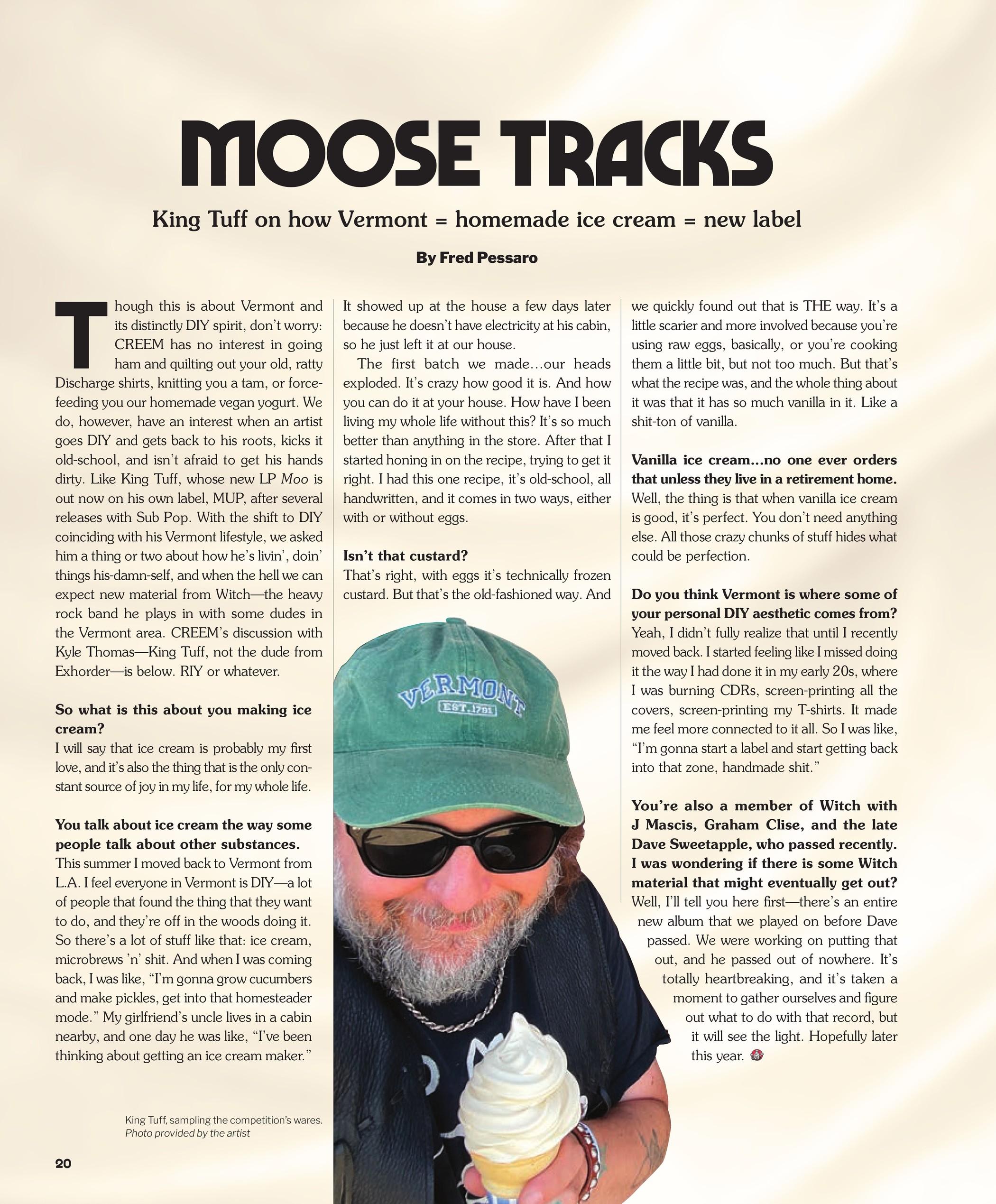 Though this is about Vermont and its distinctly DIY spirit, don’t worry: CREEM has no interest in going ham and quilting out your old, ratty Discharge shirts, knitting you a tam, or forcefeeding you our homemade vegan yogurt. We do, however, have an interest when an artist goes DIY and gets back to his roots, kicks it old-school, and isn’t afraid to get his hands dirty. Like King Tuff, whose new LP Moo is out now on his own label, MUP, after several releases with Sub Pop. With the shift to DIY coinciding with his Vermont lifestyle, we asked him a thing or two about how he’s livin’, doin’ things his-damn-self, and when the hell we can expect new material from Witch—the heavy rock band he plays in with some dudes in the Vermont area. CREEM’s discussion with Kyle Thomas—King Tuff, not the dude from Exhorder—is below. RIY or whatever.