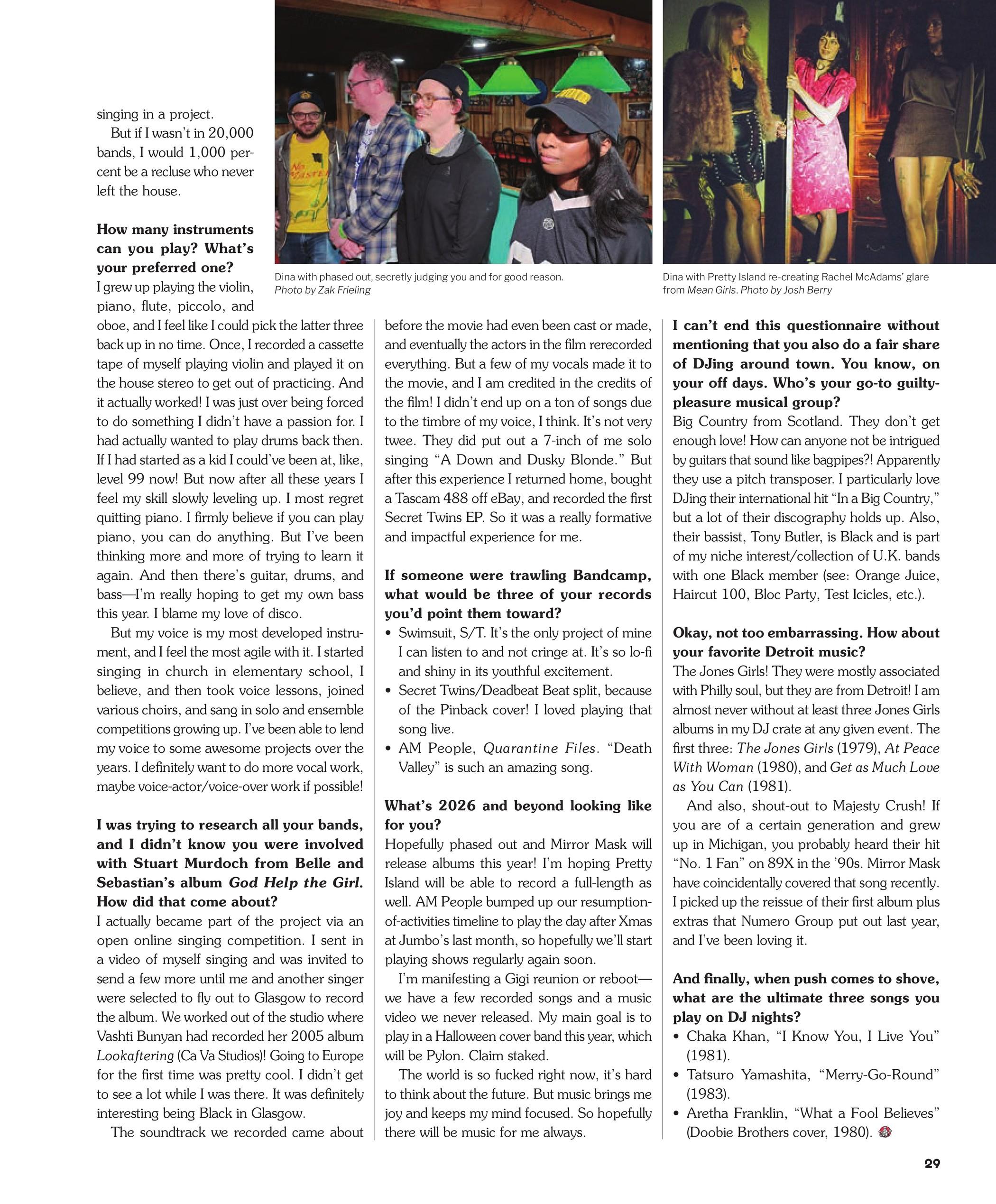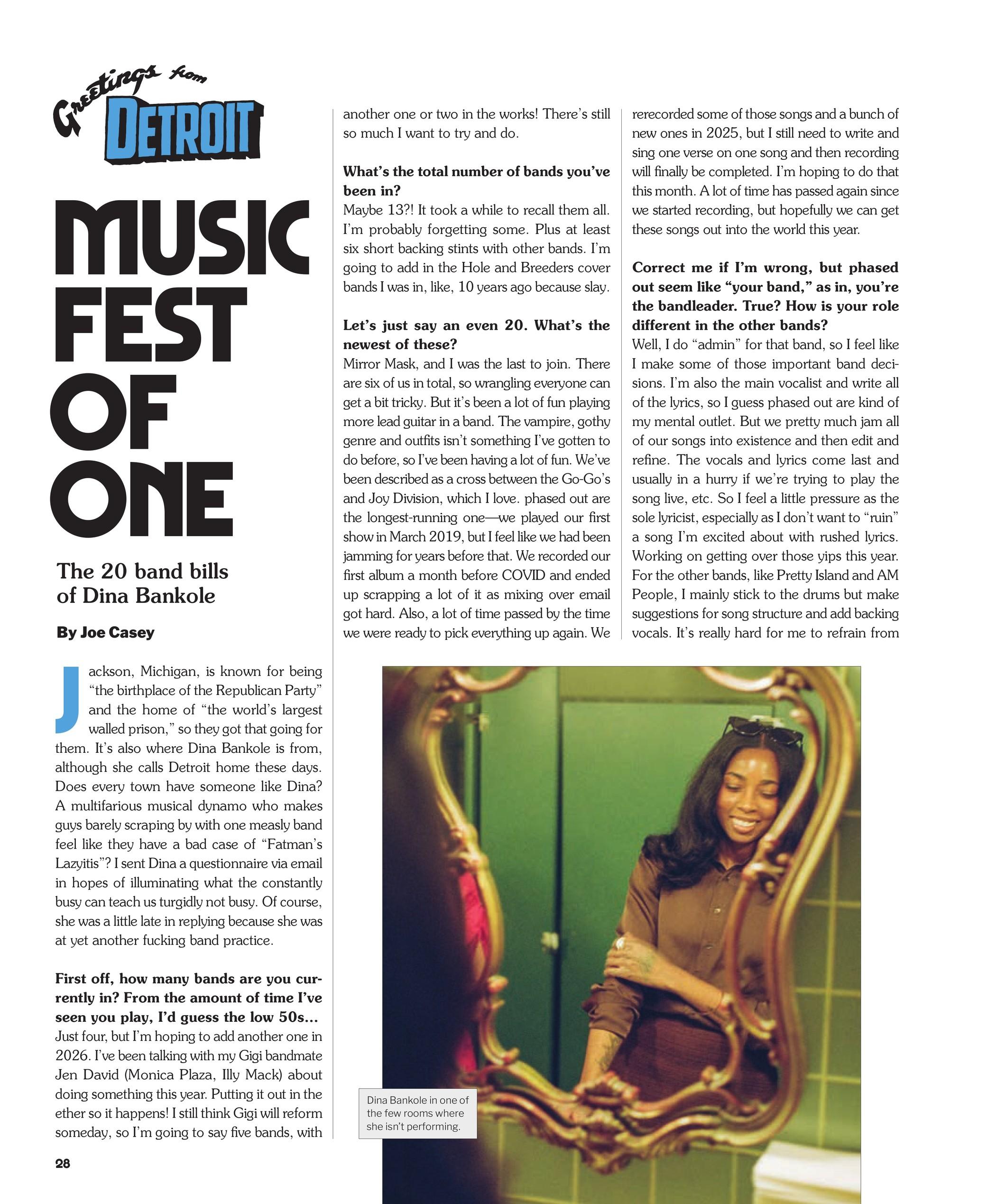 Jackson, Michigan, is known for being “the birthplace of the Republican Party” and the home of “the world’s largest walled prison,” so they got that going for them. It’s also where Dina Bankole is from, although she calls Detroit home these days. Does every town have someone like Dina? A multifarious musical dynamo who makes guys barely scraping by with one measly band feel like they have a bad case of “Fatman’s Lazyitis”? I sent Dina a questionnaire via email in hopes of illuminating what the constantly busy can teach us turgidly not busy. Of course, she was a little late in replying because she was at yet another fucking band practice.