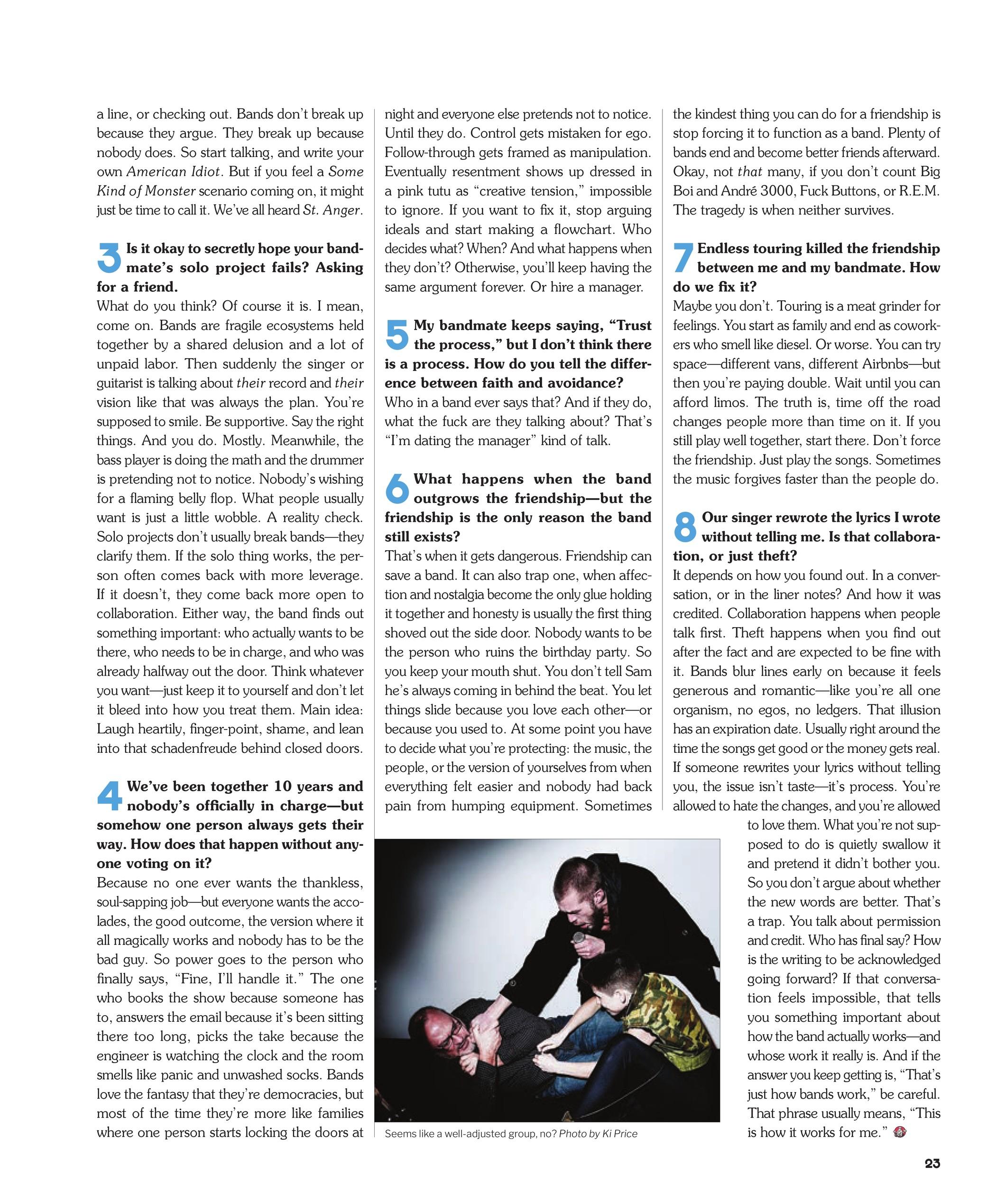 Not the column—the band problems. I thought maybe in the last issue we cleared the air, said the awkward parts out loud, shook the van crumbs out of the cushions, so that everyone would go back to fighting about tempos and guitar tones like (semi-) normal people. But no. You’re still here. Which means the band is still together. Or technically together. Or together enough to keep rehearsing and not quite enough to stop resenting each other.