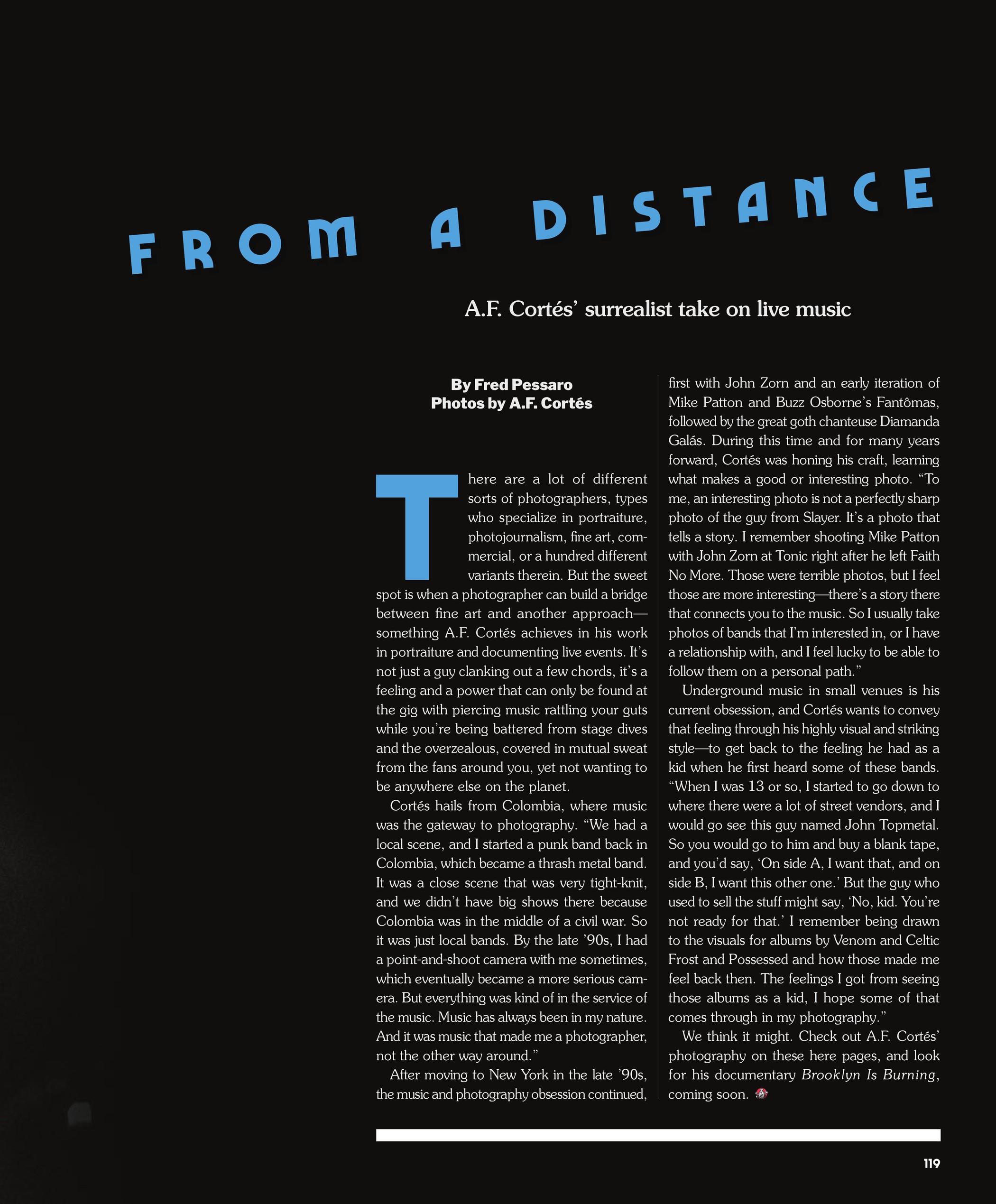 There are a lot of different sorts of photographers, types who specialize in portraiture, photojournalism, fine art, commercial, or a hundred different variants therein. But the sweet spot is when a photographer can build a bridge between fine art and another approach— something A.F. Cortés achieves in his work in portraiture and documenting live events. It’s not just a guy clanking out a few chords, it’s a feeling and a power that can only be found at the gig with piercing music rattling your guts while you’re being battered from stage dives and the overzealous, covered in mutual sweat from the fans around you, yet not wanting to be anywhere else on the planet.