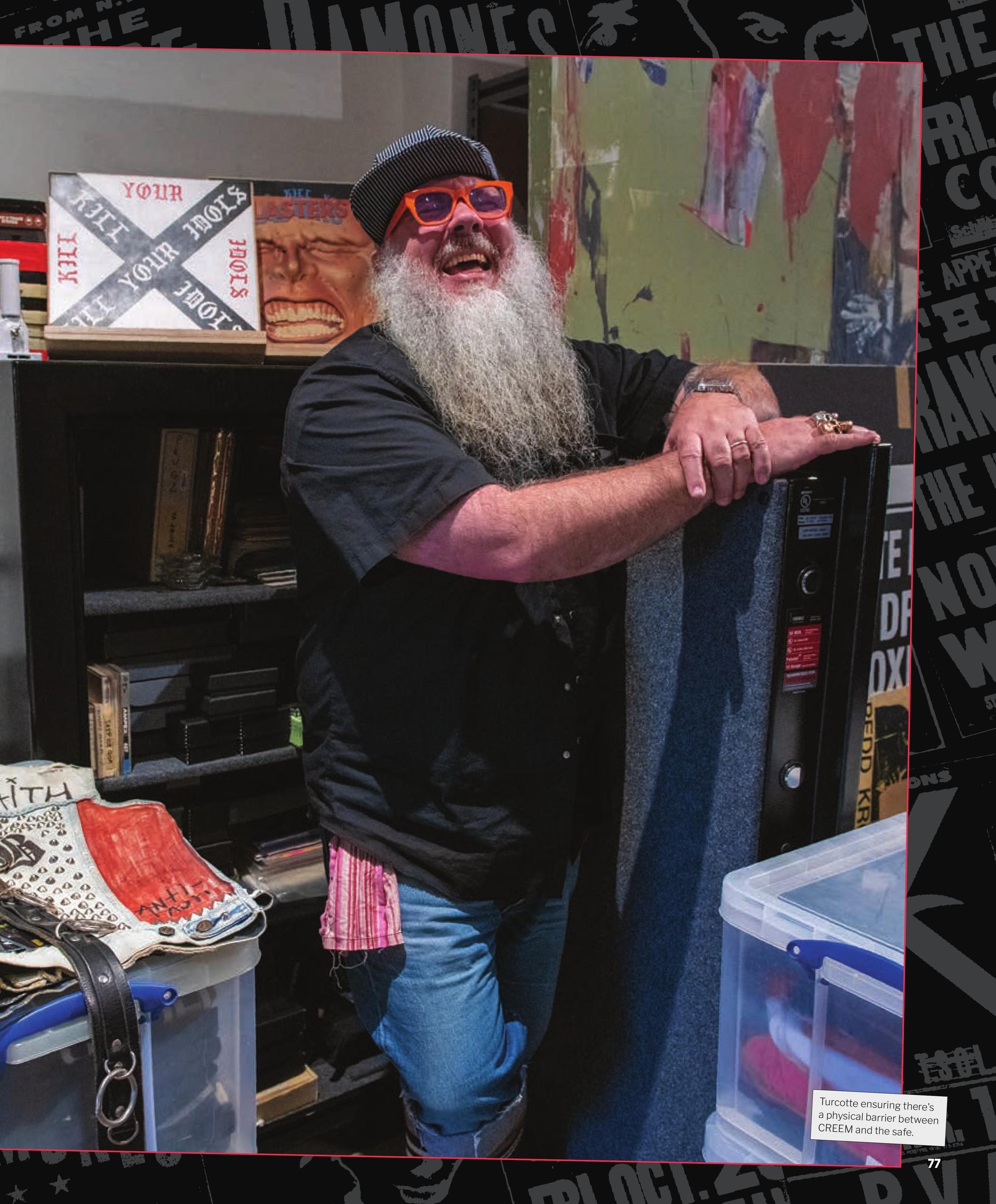Bryan Ray Turcotte, world-renowned collector of music-related ephemera and author of several books including the landmark Fucked Up + Photocopied (celebrating its 25th anniversary with a new version this year), has his office space here, and it’s packed to the gills with everything from flyers to records, shirts, buttons, and all manner of weird tchotchkes that were either a part of or changed history on their own. When I walk into the office, I see a pair of old punk friends—old in both age and years acquainted—fawning over an array of photos sitting on top of a stack of boxes. After the requisite niceties, I get the full story behind their slack jaws.