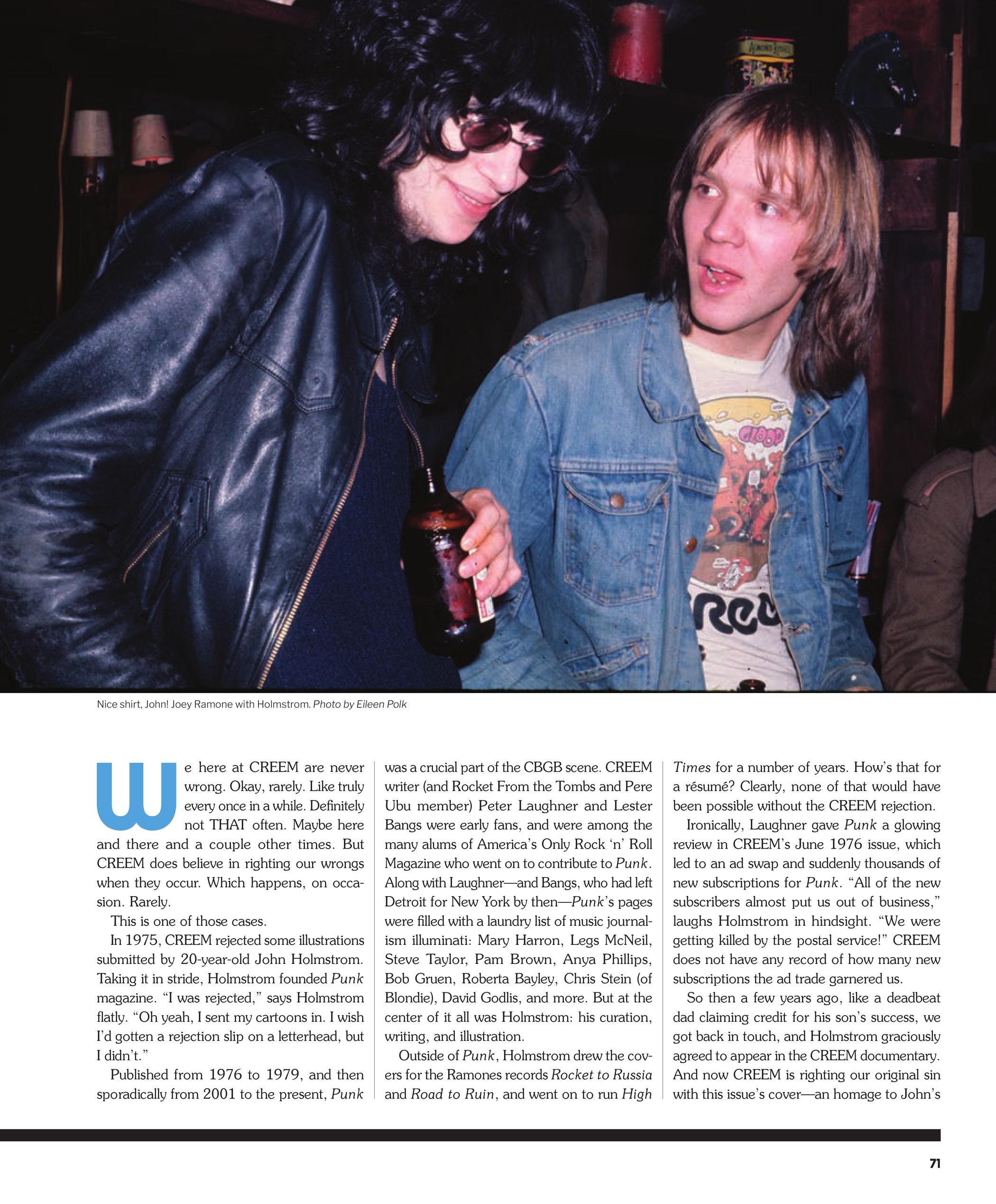 In 1975, CREEM rejected some illustrations submitted by 20-year-old John Holmstrom. Taking it in stride, Holmstrom founded Punk magazine. “I was rejected,” says Holmstrom flatly. “Oh yeah, I sent my cartoons in. I wish I’d gotten a rejection slip on a letterhead, but I didn’t.”