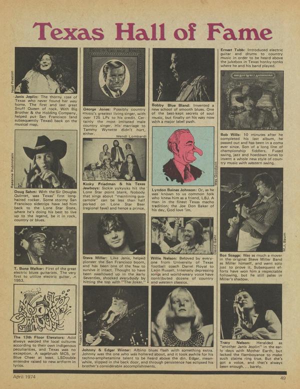 Janis Joplin: The thorny rose of Texas who never found her way home. The first and last great Snuff Queen of rock. With Big Brother & the Holding Company, helped put San Francisco (and subsequently Texas) back on the musical map. Doug Sahm: With the Sir Douglas Quintet, was Texas' first long-haired rocker.