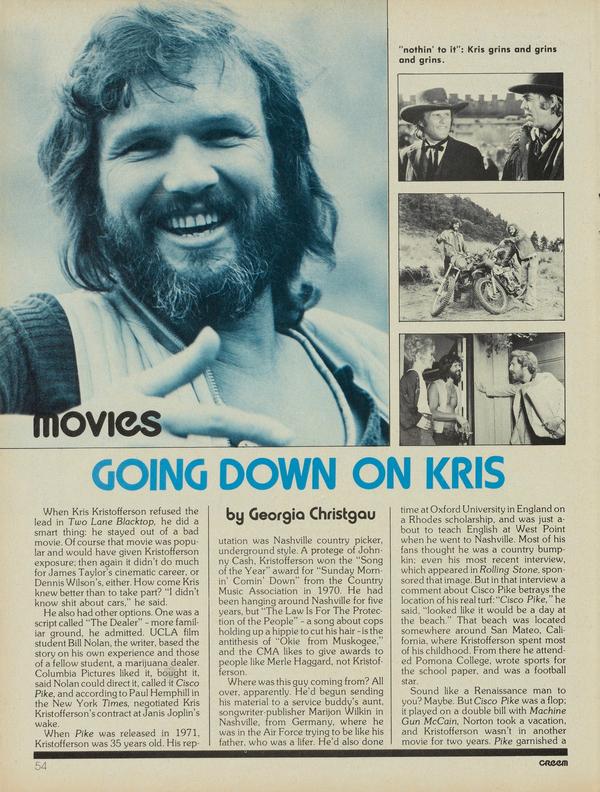 When Kris Kristofferson refused the lead in Two Lane Blacktop, he did a smart thing: he stayed out of a bad movie. Of course that movie was popular and would have given Kristofferson exposure; then again it didn’t do much for James Taylor’s cinematic career, or Dennis Wilson’s, either. How come Kris knew better than to take part? “I didn’t know shit about cars,” he said.