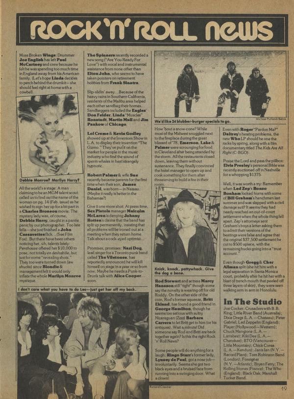 The Sgt. Pepper soundtrack, according to RSO prez Al Coury, will be a three-record set, and advance orders already total over $2 million. By the way, the film's title song/finale attracted quite a few music biggies—everyone wanted to be in on it—including Doctor John, Jose Feliciano, Stephen Stills, Wolfman Jack, Johnny Winter, Black Oak, Labelle, The Beach Boys, Herman's Hermits (yea, they're making a "comeback"), the Grateful Dead, Heart, Keith Carradine, George Benson, Seals & Crofts, Sha Na Na, Bobby Womack, Curtis Mayfield, Chita Rivera, Tina Turner, Carol Channing, Gwen Verdon, 150 singers, and—as you can see—just about everything but the kitchen sink!
