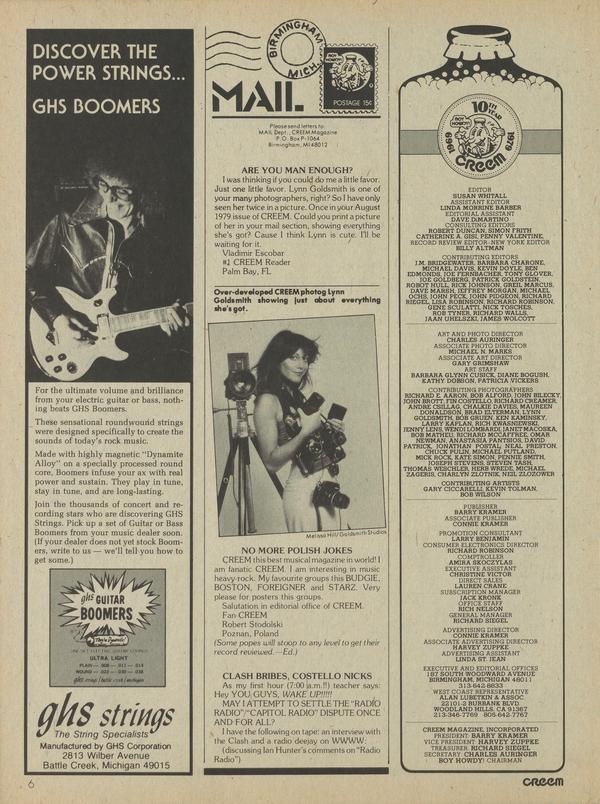 I was thinking if you could do me a little favor. Just one little favor. Lynn Goldsmith is one of your many photographers, right? So I have only seen her twice in a picture. Once in your August 1979 issue of CREEM. Could you print a picture of her in your mail section, showing everything she’s got? Cause I think Lynn is cute.