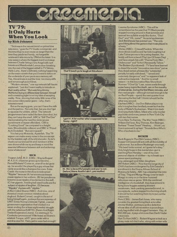 “Sickness is the newest trend on prime time television,” goes the TV Guide commercial, and this time they’re even more on target than the time they predicted handy, rechargeable wristwatch televisions by 1964 at the latest. In a new season where the biggest event is a tossup between Charlie hiring a new Angel with nerf breasts and Meadowlark Lemon slow-breaking into the cast of the biggest airball in TV history, Hello Larry, there’s definitely nothing happening on the ween-screen that you’d want to tattoo on the underside of your penis as a memory aid.