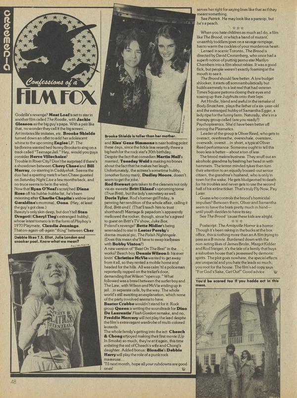 Godzilla's revenge? Meat Loaf is set to star in another film called The Roadie, with Jackie Gleason as the big guy’s papa. With a pair like that, no wonder they call it the big screen. Art imitates life imitates, etc. Brooke Shields turned down an offer to add her adolescent whine to the upcoming Eagles LP.