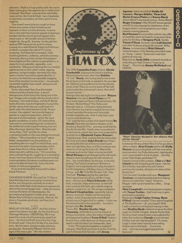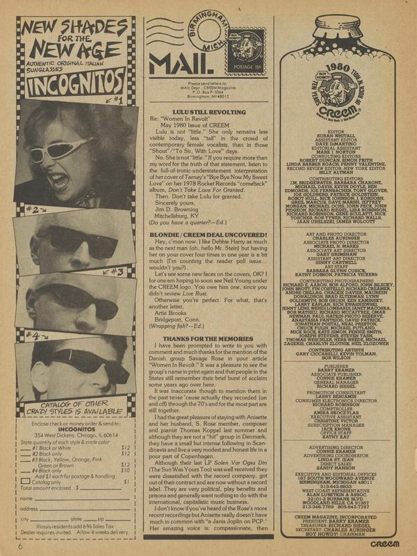 Re: “Women In Revolt” . May 1980 Issue of CREEM Lulu is not “little.” She only remains less visible today, less “tall” in the crowd of contemporary female vocalists, than in those “Shout”/“To Sir, With Love” days. No. She is not “little.” If you require more than my word for the truth of that statement, listen to the full-of-ironic-understatement interpretation of her cover of Tarney’s “Bye Bye Now My Sweet Love” on her 1978 Rocket Records, “comeback” album, Don’t Take Love For Granted.