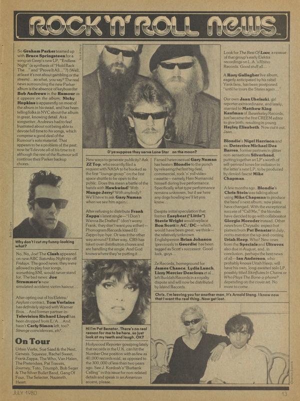 So Graham Parker teamed up with Bruce Springsteen for a song on Geep’s new LP, “Endless Night” (a synthesis of “Hold Back The.. ” and “Prove It All...”?) (Well, at least it’s not about gambling or the streets)... so what, you say? The real news surrounding the new Parker album is the absence of keyboardist Bob Andrews in the Rumour as it appears on the album; Nicky Hopkins is apparently on most of the album in his stead, and has been telling folks in NYC about the album in great, knowing detail.