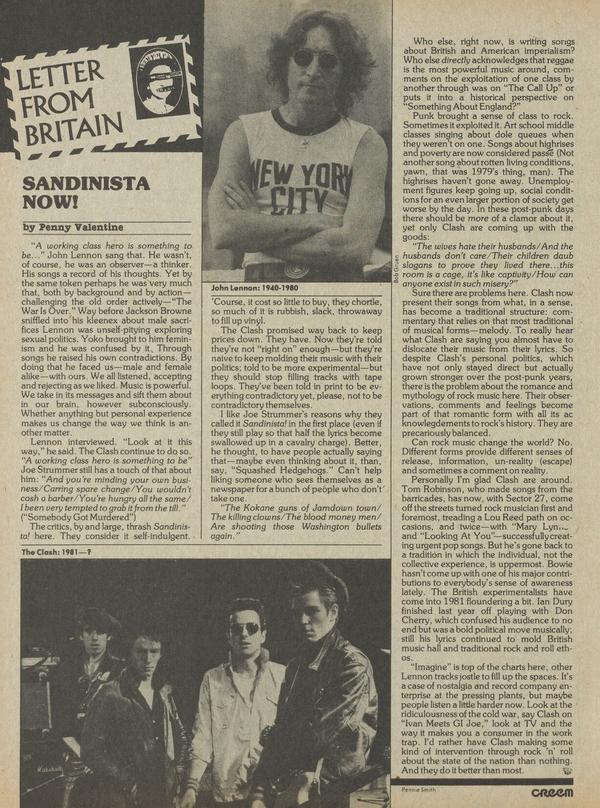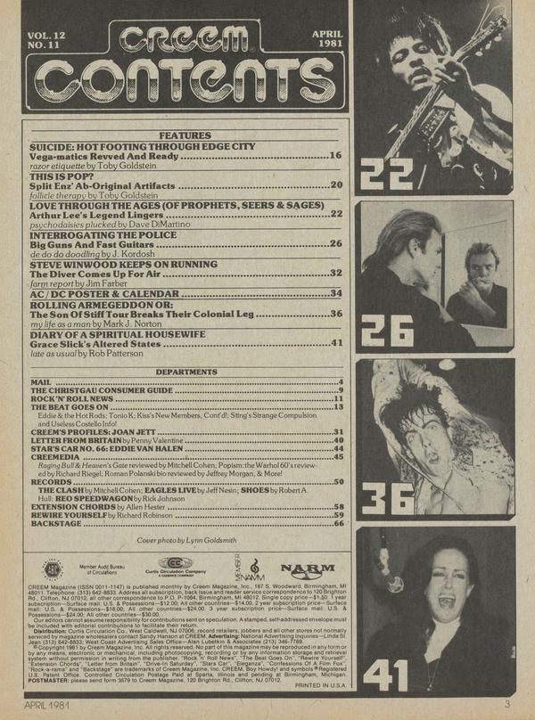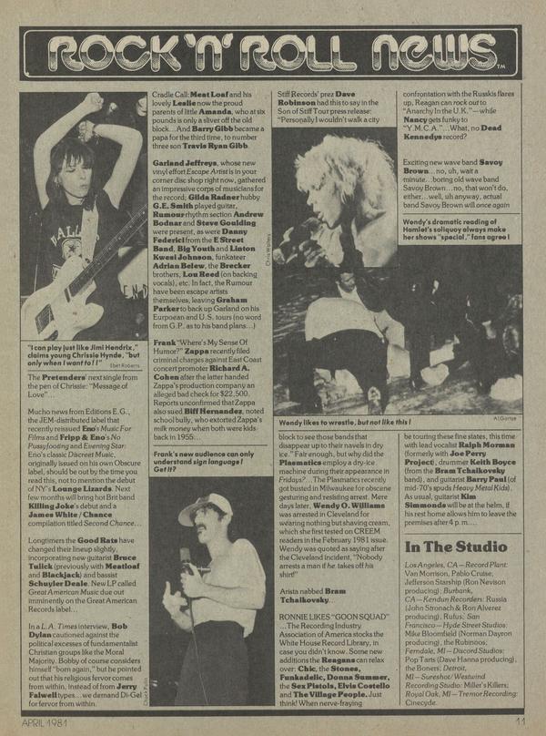 The Pretenders’ next single from the pen of Chrissie: “Message of Love”... Mucho news from Editions E.G., the JEM-distributed label that recently reissued Eno’s Music For Films and Fripp & Eno's No Pussyfooting and Evening Star: Eno’s classic Discreet Music, originally issued on his own Obscure label, should be out by the time you read this, not to mention the debut of NY’s Lounge Lizards.