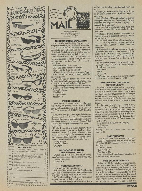 JOHNSON BONER EXPLAINED! The Heavily-Into-Numbers branch of the Ranger Institute has just completed the statistical analysis of the 1980 CREEM Reader’s Poll, with special attention on the tragic, unexpected results of the Rock Crydick portion, which this year was sleazed by the ever-unlikely Rick Johnson.