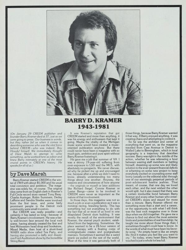 (On January 29 CREEM publisher and founder Barry Kramer died at 37, just as we were going to press. Our business is words, but they rather fail us when it comes to describing someone who was the vital force behind CREEM—who was indeed, Boy Howdy! himself.