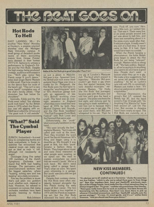 Hot Rods To Hell EAST LANSING, Ml— It’s another “New Wave” Monday at Dooley’s, a preppie-oriented showbar near the Michigan State University campus. A small group of decadent punks (some of them accounting majors from Grosse Pointe) have dressed in their hottest 1977 U.K. fashions to witness a performance by England’s Eddie and the Hot Rods.