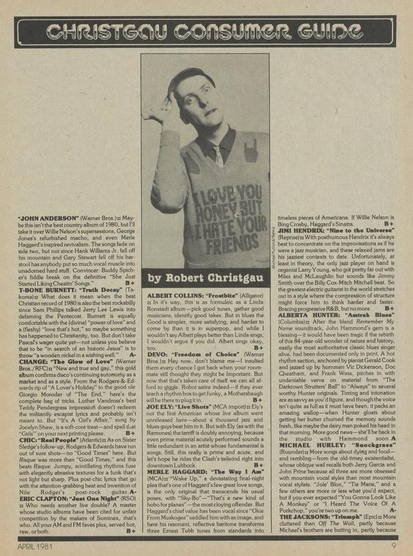 “JOHN ANDERSON” (Warner Bros.):: Maybe this isn’t the best country album of 1980, but I’ll take it over Willie Nelson’s supersessions, George Jones’s refurbished macho, and even Merle Haggard’s inspired revivalism. The songs fade on side two, but not since Hank Williams Jr. fell off his mountain and Gary Stewart fell off his barstool has anybody put so much vocal muscle into unadorned hard stuff.