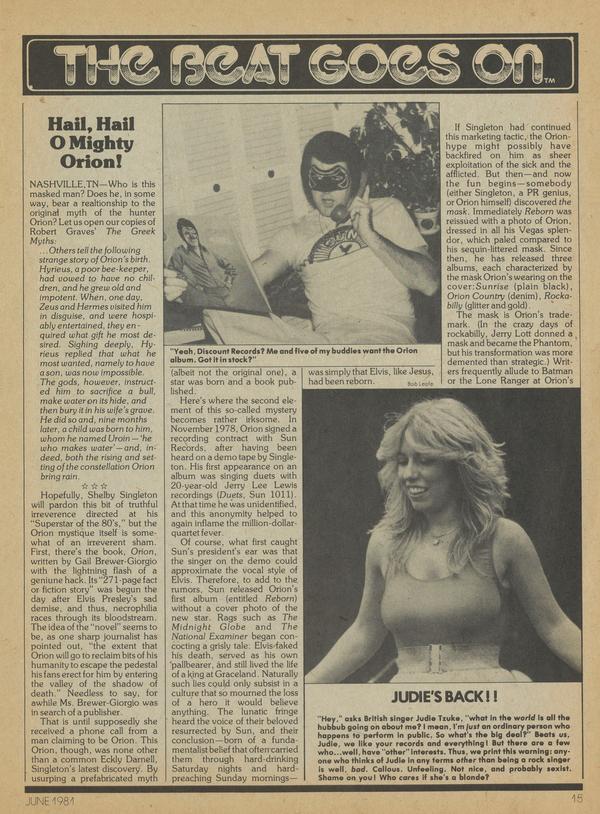 Hopefully, Shelby Singleton will pardon this bit of truthful irreverence directed at his "Superstar of the 80's," but the Orion mystique itself is somewhat of an irreverent sham. First, there's the book, Orion, written by Gail Brewer-Giorgio with the lightning flash of a genuine hack.