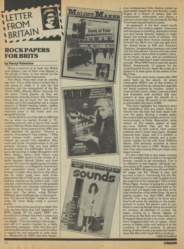 New Music News died over six months ago now. For a while there it looked like it was going to make it. It was the first intrusion into the strangehold of the Big Three (NME, Melody Maker, Sounds) for ten years. Trade papers, as they are sometimes cynically known (the inference being they are as much ‘for’ the record industry as for the readership) are a unique product of British reading habits, weekly nationwide rock newspapers, and of our historical place in the music and our geographical size.