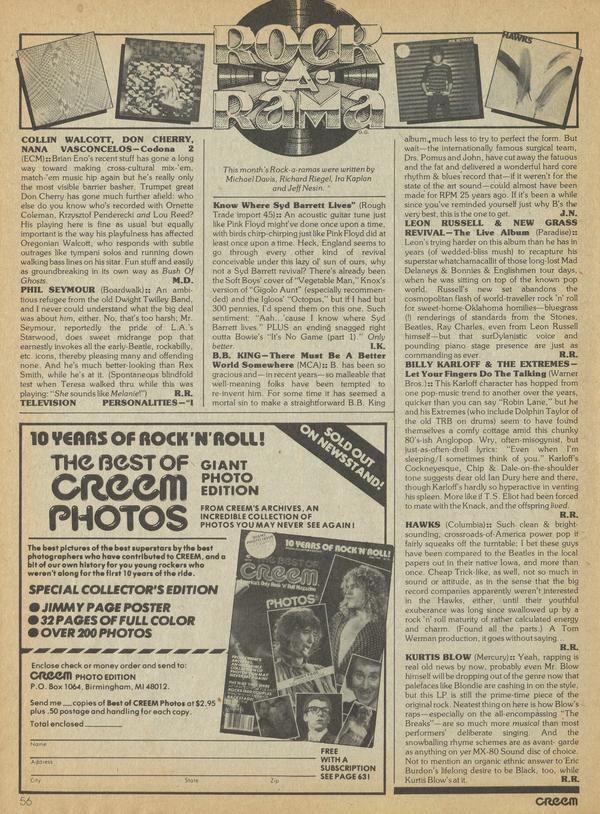 Good news: Donald Roeser, Cult's whiz-guitarist Buck Dharma, will be releasing a solo "Don't Fear The Reaper" and the best Cult tunes of recent years, so said LP should be guaranteed hot stuff... Other solo LP news includes that of highly volatile Kink Dave Davies, who's just finished his second for RCA, apparently called Glamour.