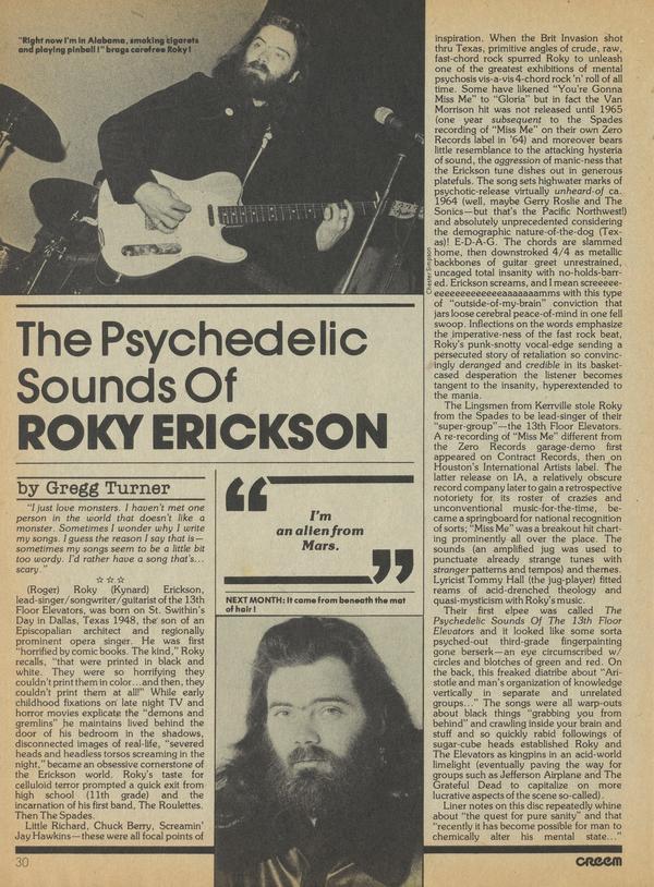 (Roger) Roky (Kynard) Erickson, lead-singer/songwriter/guitarist of the 13th Floor Elevators, was born on St. Swithin's Day in Dallas, Texas 1948, the son of an Episcopalian architect and regionally prominent opera singer. He was first horrified by comic books.