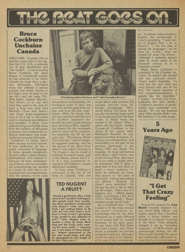 NEW YORK—If quality will out and the cream rises to the top, then the U.S. of A. is seriously out of step—blindfolded andear-muffed—in not according Bruce Cockburn the same degree of commercial success he has achieved in his native Canada for more than a decade.