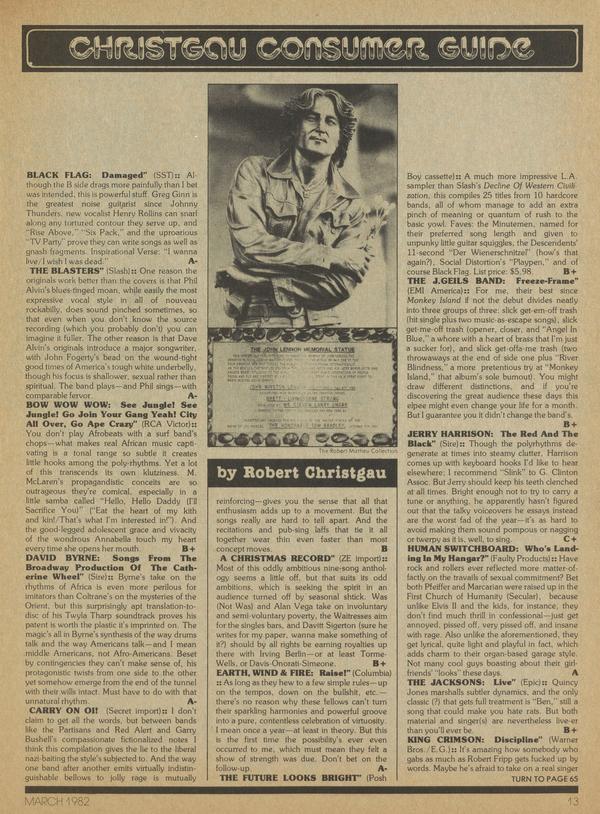 BLACK FLAG: Damaged (SST):: Although the B side drags more painfully than I bet was intended, this is powerful stuff. Greg Ginn is the greatest noise guitarist since Johnny Thunders, new, vocalist Henry Rollins can snarl along any tortured contour they serve up, andRise Above,Six Pack, and the uproariousTV Party prove they can write songs as well as gnash fragments.