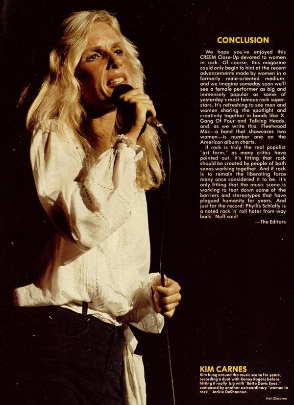 We hope you've enjoyed this CREEM Close-Up devoted to women in rock. Of course, this magazine could only begin to hint at the recent advancements made by women in a formerly male-oriented medium, and we imagine someday soon we ll see a female performer as big and immensely popular as some of yesterday's most famous rock superstars.