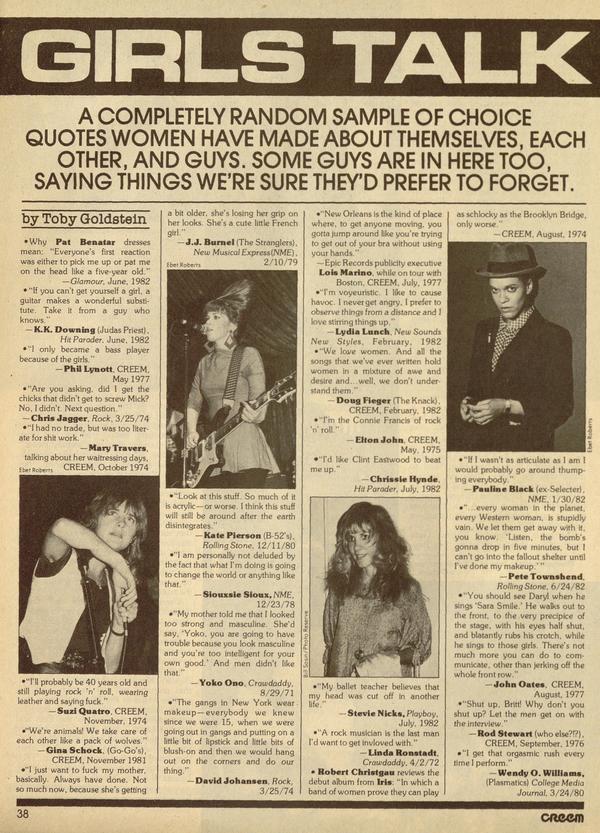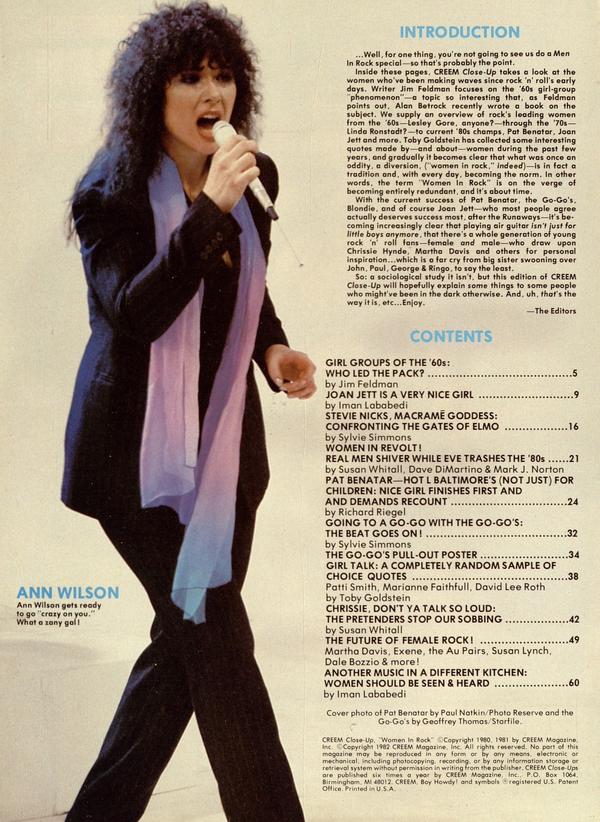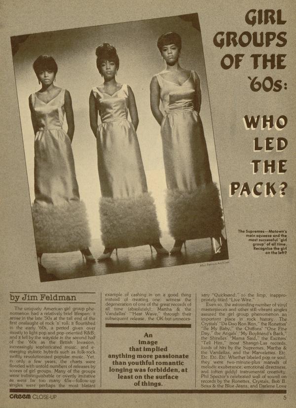 ...Well, for one thing, you're not going to see us do a Men In Rock special—so that's probably the point. Inside these pages, CREEM Close-Up takes a look at the women who've been making waves since rock 'n' roll's early days. Writer Jim Feldman focuses on the '60s girl-group phenomenon”—a topic so interesting that, as Feldman points out, Alan Betrock recently wrote a book on the subject.