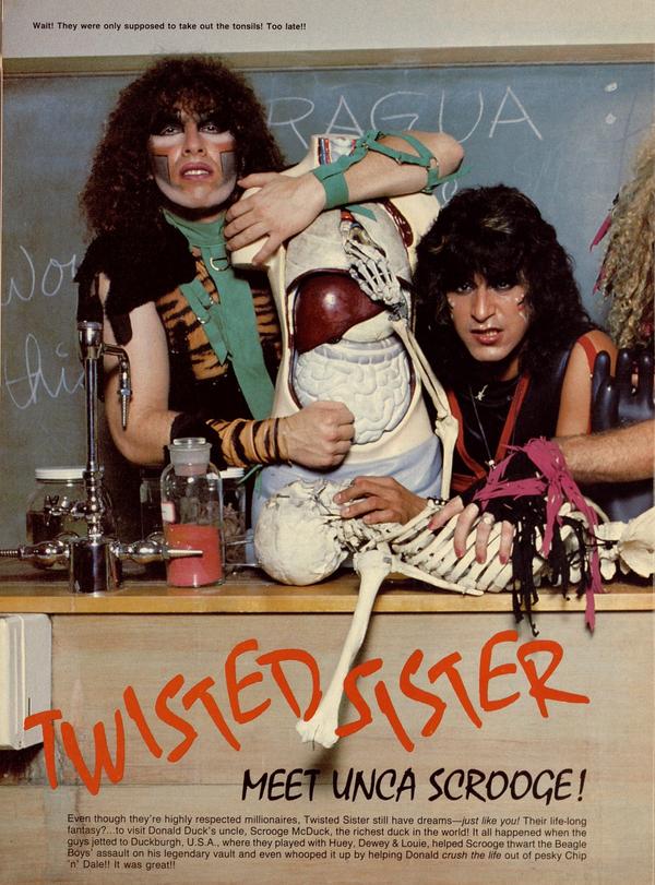 Even though they’re highly respected millionaires, Twisted Sister still have dreams—just like you! Their life-long fantasy?...to visit Donald Duck’s uncle, Scrooge McDuck, the richest duck in the world! It all happened when the guys jetted to Duckburgh, U.S.A., where they played with Huey, Dewey & Louie, helped Scrooge thwart the Beagle Boys’ assault on his legendary vault and even whooped it up by helping Donald crush the life out of pesky Chip ’n’ Dale!! It was great!!