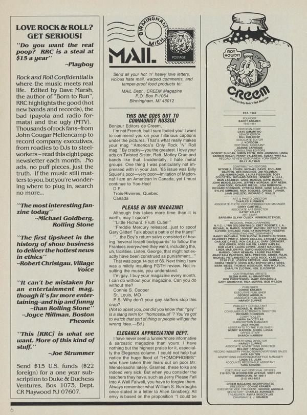 Send all your hot ’n’ heavy love letters, vicious hate mail, warped comments, and tamper-proof food products to: MAIL Dept., CREEM Magazine P.O. Box P-1064 Birmingham, Ml 48012 THIS ONE GOES OUT TO COMMUNIST RUSSIA! Bonjour Editors de Creem, I’m not French, but I sure fooled you!