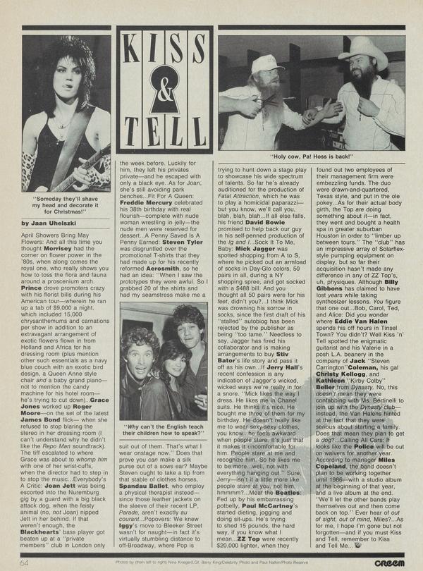 April Showers Bring May Flowers: And all this time you thought Morrisey had the corner on flower power in the ’80s, when along comes the royal one, who really shows you how to toss the flora and fauna around a proscenium arch. Prince drove promoters crazy with his florist bills during his American tour—wherein he ran up a tab of $9,000 a night, which included 15,000 chrysanthemums and carnations per show in addition to an extravagant arrangement of exotic flowers flown in from Holland and Africa for his dressing room (plus mention other such essentials as a navy blue couch with an exotic bird design, a Queen Anne style chair and a baby grand piano— not to mention the candy machine for his hotel room— he’s trying to cut down)...Grace Jones worked up Roger Moore—on the set of the latest James Bond flick— when she refused to stop blaring the stereo in her dressing room (I can’t understand why he didn’t like the Repo Man soundtrack).