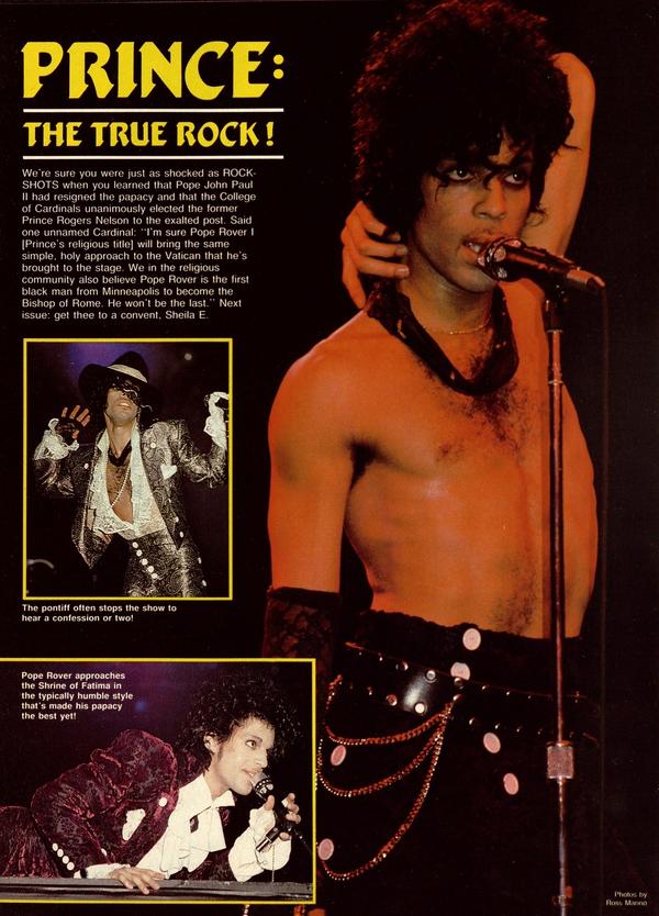 We’re sure you were just as shocked as ROCKSHOTS when you learned that Pope John Paul II had resigned the papacy and that the College of Cardinals unanimously elected the former Prince Rogers Nelson to the exalted post. Said one unnamed Cardinal: “I’m sure Pope Rover I [Prince’s religious title] will bring the same simple, holy approach to the Vatican that he’s brought to the stage.