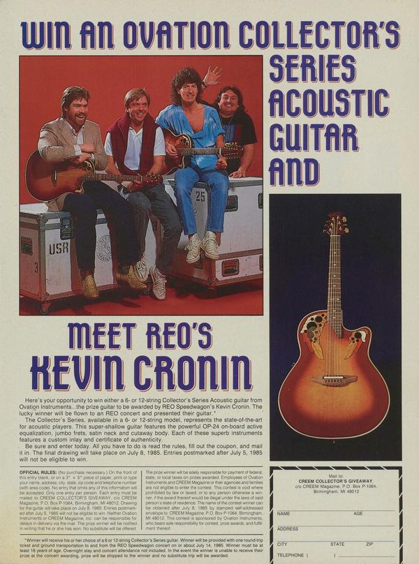 Here’s your opportunity to win either a 6or 12-string Collector’s Series Acoustic guitar from Ovation Instruments...the prize guitar to be awarded by REO Speedwagon’s Kevin Cronin. The lucky winner will be flown to an REO concert and presented their guitar.*