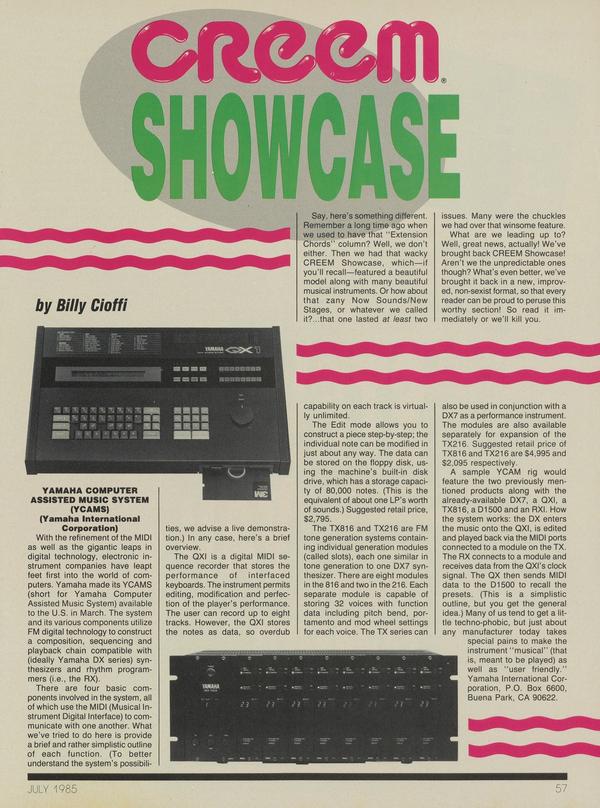 YAMAHA COMPUTER ASSISTED MUSIC SYSTEM (YCAMS) (Yamaha International Corporation) With the refinement of the MIDI as well as the gigantic leaps in digital technology, electronic instrument companies have leapt feet first into the world of computers.