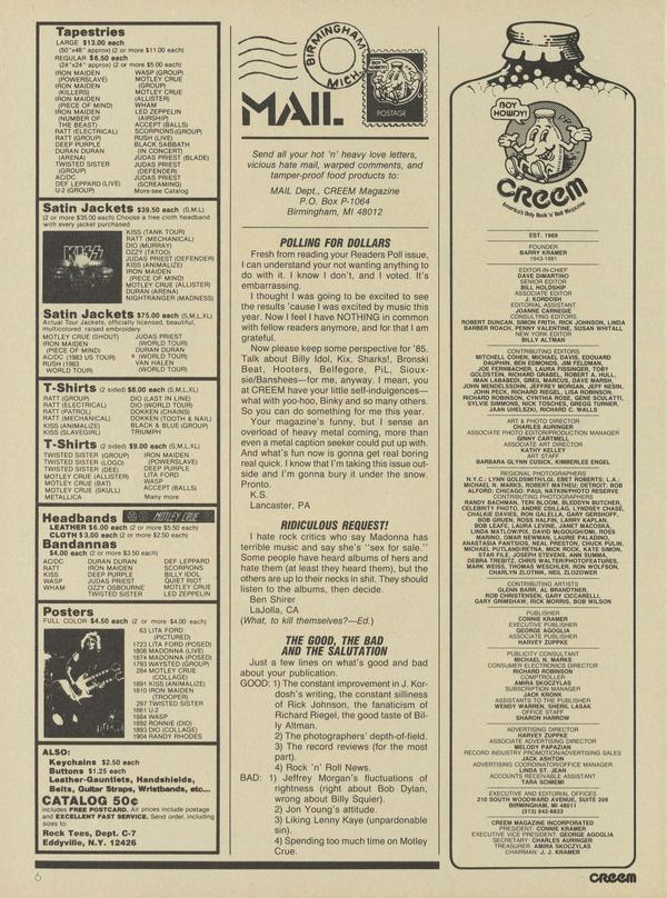 Send all your hot ’n’ heavy love letters, vicious hate mail, warped comments, and tamper-proof food products to: MAIL Dept., CREEM Magazine P.O. Box P-1064 Birmingham, Ml 48012 POLLING FOR DOLLARS Fresh from reading your Readers Poll issue, I can understand your not wanting anything to do with it.