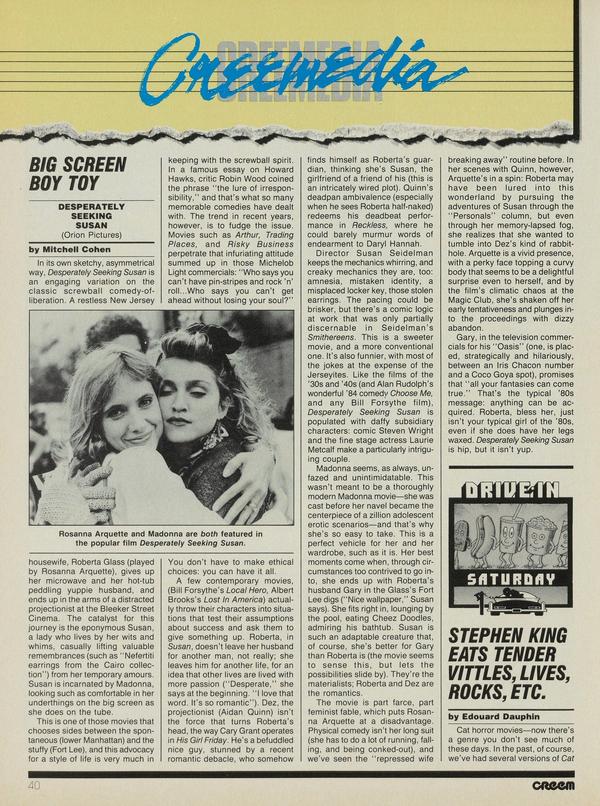 In its own sketchy, asymmetrical way, Desperately Seeking Susan is an engaging variation on the classic screwball comedy-of-liberation. A restless New Jersey housewife, Roberta Glass (played by Rosanna Arquette), gives up her microwave and her hot-tub peddling yuppie husband, and ends up in the arms of a distracted projectionist at the Bleeker Street Cinema.