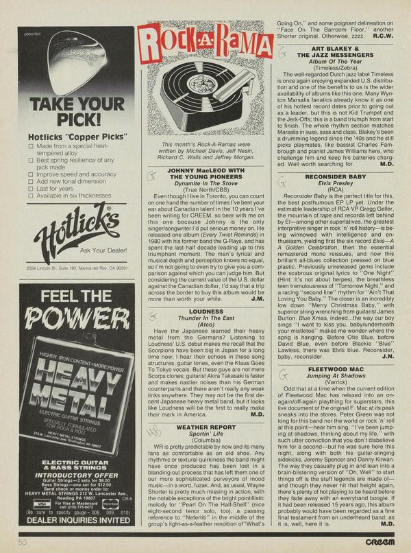 Dio stands tall! Yep, Jimmy Bain and Vivian Campbell, both of Dio, have organized Hear ’N’ Aid, a heavy metal aggregate ala USA For Africa. Tracks have already been recorded for a song called “Stars"—written by Dio, the man— and those slated to contribute via overdubs are Lita Ford, Judas Priest, the Scorpions, Iron Maiden, Quiet Riot, Dokken, Ratt, Y & T, Bon Jovi, Night Ranger, Black Sabbath, Queensryche and Spinal Tap.