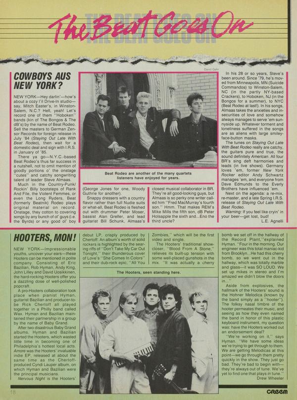 NEW YORK—Hey darlin’—how’s about a cozy I’il Drive-In studio— say, Mitch Easter’s, in WinstonSalem, N.C.? Hell, yeah! Let’s record one of them “Hoboken” bands (kin of The Bongos & The dB’s) by the name of Beat Rodeo. Sell the masters to German Zensor Records for foreign release in July ’84 (Staying Out Late With Beat Rodeo), then wait for a domestic deal and sign with I.R.S. in January of ’85.