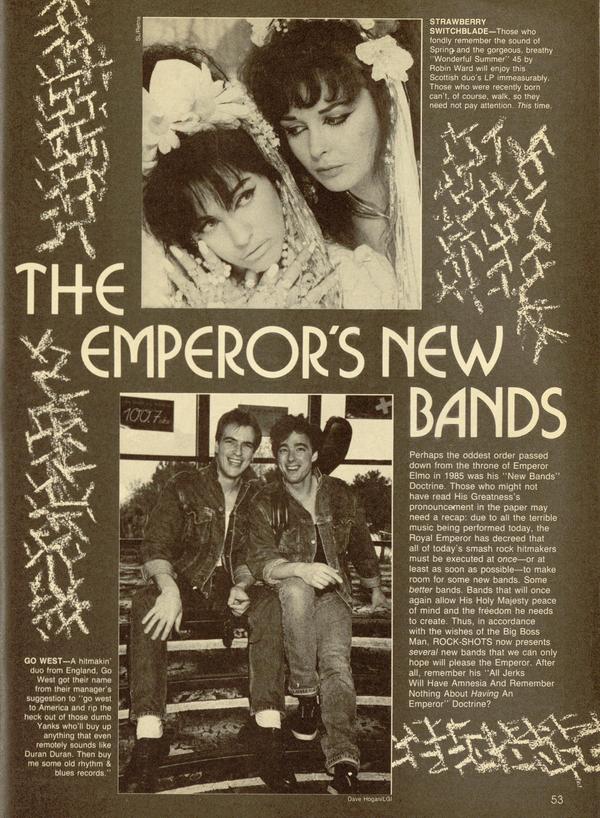 Perhaps the oddest order passed down from the throne of Emperor Elmo in 1985 was his "New Bands" Doctrine. Those who might not have read His Greatness's pronouncement in the paper may need a recap: due to all the terrible music being performed today, the Royal Emperor has decreed that all of today's smash rock hitmakers must be executed at once—or at least as soon as possible—to make room for some new bands.